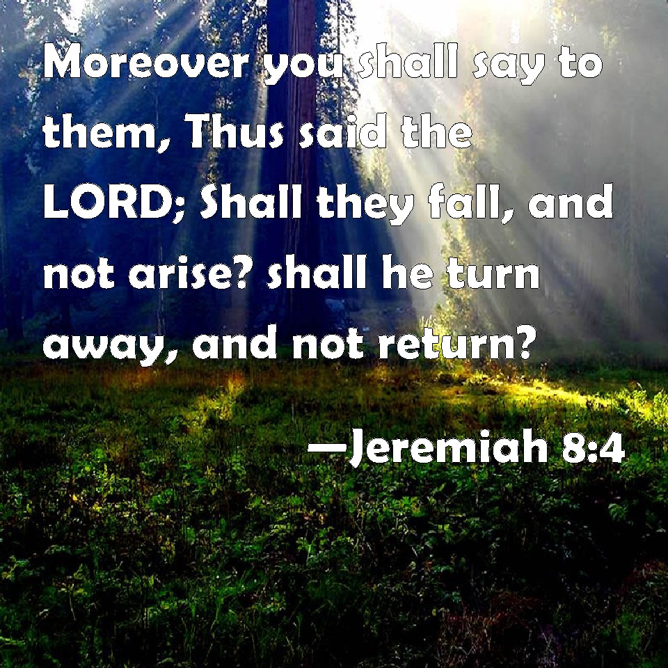 Choose a Background Jeremiah 8:4 Moreover you shall say to them, Thus said the LORD; Shall they fall, and not arise? shall he turn away, and not return? KJV: Moreover thou shalt say unto them, Thus saith the LORD; Shall they fall, and not arise? shall he turn away, and not return? DRB: And thou shalt say to them: Thus saith the Lord: Shall not he that falleth, rise again? and he that is turned away, shall he not turn again? DBT: And thou shalt say unto them, Thus saith Jehovah: Do men fall, and not rise up? Doth one turn away, and not return? ERV: Moreover thou shalt say unto them, Thus saith the LORD: shall men fall, and not rise up again? shall one turn away, and not return? WBT: Moreover, thou shalt say to them, Thus saith the LORD; Shall they fall, and not arise? shall he turn away, and not return? WEB: Moreover you shall tell them, Thus says Yahweh: Shall men fall, and not rise up again? Shall one turn away, and not return? YLT: And thou hast said unto them: Thus said Jehovah, Do they fall, and not rise? Doth he turn back, and not return?Links Jeremiah 8:4 NIV • Jeremiah 8:4 NLT • Jeremiah 8:4 ESV • Jeremiah 8:4 NASB • Jeremiah 8:4 KJV • Jeremiah 8:4 Interlinear • Jeremiah 8:4 Commentaries • Jeremiah 8:4 Parallel Texts • Jeremiah 8:4 Bible Apps • Jeremiah 8:4 Parallel • Bible Hub |
