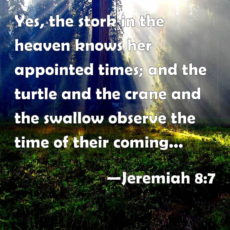 Choose a Background Jeremiah 8:7 Yes, the stork in the heaven knows her appointed times; and the turtle and the crane and the swallow observe the time of their coming; but my people know not the judgment of the LORD. KJV: Yea, the stork in the heaven knoweth her appointed times; and the turtle and the crane and the swallow observe the time of their coming; but my people know not the judgment of the LORD. DRB: The kite in the air hath known her time: the turtle, and the swallow, and the stork have observed the time of their coming: but my people have not known the judgment of the Lord. DBT: Even a stork in the heavens knoweth her appointed times, and the turtle-dove and the swallow and the crane observe the time of their coming; but my people know not the judgment of Jehovah. ERV: Yea, the stork in the heaven knoweth her appointed times; and the turtle and the swallow and the crane observe the time of their coming; but my people know not the ordinance of the LORD. WBT: Yes, the stork in the heaven knoweth her appointed times; and the turtle and the crane and the swallow observe the time of their coming; but my people know not the judgment of the LORD. WEB: Yes, the stork in the sky knows her appointed times; and the turtledove and the swallow and the crane observe the time of their coming; but my people don't know Yahweh's law. YLT: Even a stork in the heavens hath known her seasons, And turtle, and swallow, and crane, Have watched the time of their coming, And — My people have not known the judgment of Jehovah.Links Jeremiah 8:7 NIV • Jeremiah 8:7 NLT • Jeremiah 8:7 ESV • Jeremiah 8:7 NASB • Jeremiah 8:7 KJV • Jeremiah 8:7 Interlinear • Jeremiah 8:7 Commentaries • Jeremiah 8:7 Parallel Texts • Jeremiah 8:7 Bible Apps • Jeremiah 8:7 Parallel • Bible Hub |