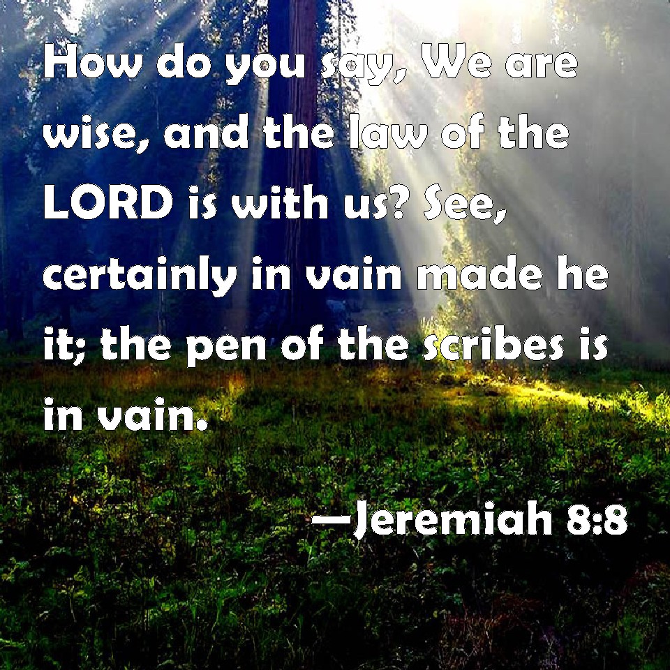 Choose a Background Jeremiah 8:8 How do you say, We are wise, and the law of the LORD is with us? See, certainly in vain made he it; the pen of the scribes is in vain. KJV: How do ye say, We are wise, and the law of the LORD is with us? Lo, certainly in vain made he it; the pen of the scribes is in vain. DRB: How do you say: We are wise, and the law of the Lord is with us? Indeed the lying pen of the scribes hath wrought falsehood. DBT: How do ye say, We are wise, and the law of Jehovah is with us? Behold, certainly the lying pen of the scribes hath made it falsehood. ERV: How do ye say, We are wise, and the law of the LORD is with us? But, behold, the false pen of the scribes hath wrought falsely. WBT: How do ye say, We are wise, and the law of the LORD is with us? Lo, certainly in vain he hath made it; the pen of the scribes is in vain. WEB: How do you say, We are wise, and the law of Yahweh is with us? But, behold, the false pen of the scribes has worked falsely. YLT: How do ye say, We are wise, And the law of Jehovah is with us? Surely, lo, falsely it hath wrought, The false pen of scribes.Links Jeremiah 8:8 NIV • Jeremiah 8:8 NLT • Jeremiah 8:8 ESV • Jeremiah 8:8 NASB • Jeremiah 8:8 KJV • Jeremiah 8:8 Interlinear • Jeremiah 8:8 Commentaries • Jeremiah 8:8 Parallel Texts • Jeremiah 8:8 Bible Apps • Jeremiah 8:8 Parallel • Bible Hub |