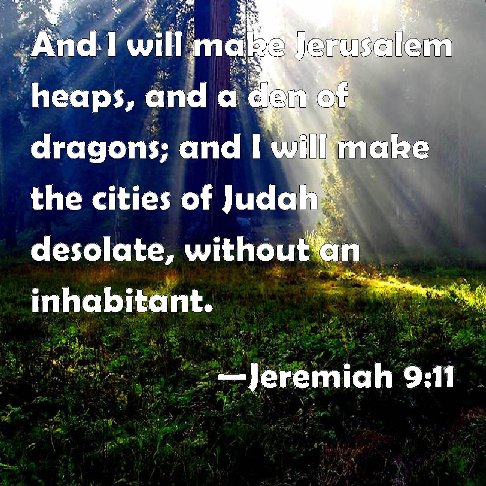 Choose a Background Jeremiah 9:11 And I will make Jerusalem heaps, and a den of dragons; and I will make the cities of Judah desolate, without an inhabitant. KJV: And I will make Jerusalem heaps, and a den of dragons; and I will make the cities of Judah desolate, without an inhabitant. DRB: And I will make Jerusalem to be heaps of sand, and dens of dragons: and I will make the cities of Juda desolate, for want of an inhabitant. DBT: And I will make Jerusalem heaps, a dwelling-place of jackals; and I will make the cities of Judah a desolation, without inhabitant. ERV: And I will make Jerusalem heaps, a dwelling place of jackals; and I will make the cities of Judah a desolation, without inhabitant. WBT: And I will make Jerusalem heaps, and a den of dragons; and I will make the cities of Judah desolate, without an inhabitant. WEB: I will make Jerusalem heaps, a dwelling place of jackals; and I will make the cities of Judah a desolation, without inhabitant. YLT: And I make Jerusalem become heaps, A habitation of dragons, And the cities of Judah I make a desolation, Without inhabitant.Links Jeremiah 9:11 NIV • Jeremiah 9:11 NLT • Jeremiah 9:11 ESV • Jeremiah 9:11 NASB • Jeremiah 9:11 KJV • Jeremiah 9:11 Interlinear • Jeremiah 9:11 Commentaries • Jeremiah 9:11 Parallel Texts • Jeremiah 9:11 Bible Apps • Jeremiah 9:11 Parallel • Bible Hub |