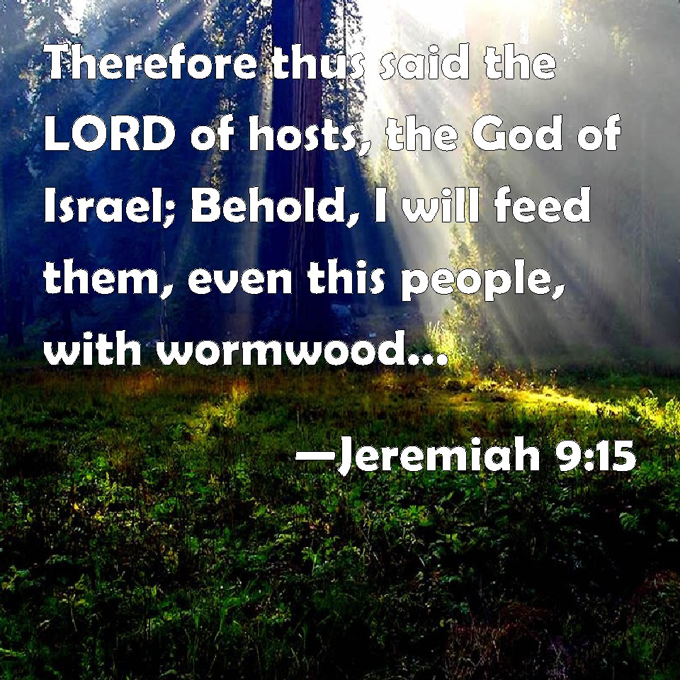 Choose a Background Jeremiah 9:15 Therefore thus said the LORD of hosts, the God of Israel; Behold, I will feed them, even this people, with wormwood, and give them water of gall to drink. KJV: Therefore thus saith the LORD of hosts, the God of Israel; Behold, I will feed them, even this people, with wormwood, and give them water of gall to drink. DRB: Therefore thus saith the Lord of hosts the God of Israel: Behold I will feed this people with wormwood, and give them water of gall to drink. DBT: therefore thus saith Jehovah of hosts, the God of Israel, Behold, I will feed this people with wormwood, and give them water of gall to drink, ERV: therefore thus saith the LORD of hosts, the God of Israel, Behold, I will feed them, even this people, with wormwood, and give them water of gall to drink. WBT: Therefore thus saith the LORD of hosts, the God of Israel; Behold, I will feed them, even this people, with wormwood, and give them water of gall to drink. WEB: therefore thus says Yahweh of Armies, the God of Israel, Behold, I will feed them, even this people, with wormwood, and give them water of gall to drink. YLT: Therefore, thus said Jehovah of Hosts, God of Israel: Lo, I am causing them — this people — to eat wormwood, And I have caused them to drink water of gall,Links Jeremiah 9:15 NIV • Jeremiah 9:15 NLT • Jeremiah 9:15 ESV • Jeremiah 9:15 NASB • Jeremiah 9:15 KJV • Jeremiah 9:15 Interlinear • Jeremiah 9:15 Commentaries • Jeremiah 9:15 Parallel Texts • Jeremiah 9:15 Bible Apps • Jeremiah 9:15 Parallel • Bible Hub |
