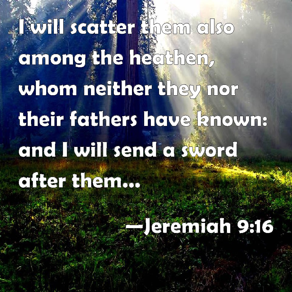 Choose a Background Jeremiah 9:16 I will scatter them also among the heathen, whom neither they nor their fathers have known: and I will send a sword after them, till I have consumed them. KJV: I will scatter them also among the heathen, whom neither they nor their fathers have known: and I will send a sword after them, till I have consumed them. DRB: And I will scatter them among the nations, which they and their fathers have not known: and I will send the sword after them till they be consumed. DBT: and will scatter them among the nations, whom neither they nor their fathers have known; and I will send the sword after them, till I have consumed them. ERV: I will scatter them also among the nations, whom neither they nor their fathers have known: and I will send the sword after them, till I have consumed them. WBT: I will scatter them also among the heathen, whom neither they nor their fathers have known: and I will send a sword after them, till I have consumed them. WEB: I will scatter them also among the nations, whom neither they nor their fathers have known; and I will send the sword after them, until I have consumed them. YLT: And I have scattered them among nations Which they knew not, they and their fathers, And have sent after them the sword, Till I have consumed them.Links Jeremiah 9:16 NIV • Jeremiah 9:16 NLT • Jeremiah 9:16 ESV • Jeremiah 9:16 NASB • Jeremiah 9:16 KJV • Jeremiah 9:16 Interlinear • Jeremiah 9:16 Commentaries • Jeremiah 9:16 Parallel Texts • Jeremiah 9:16 Bible Apps • Jeremiah 9:16 Parallel • Bible Hub |