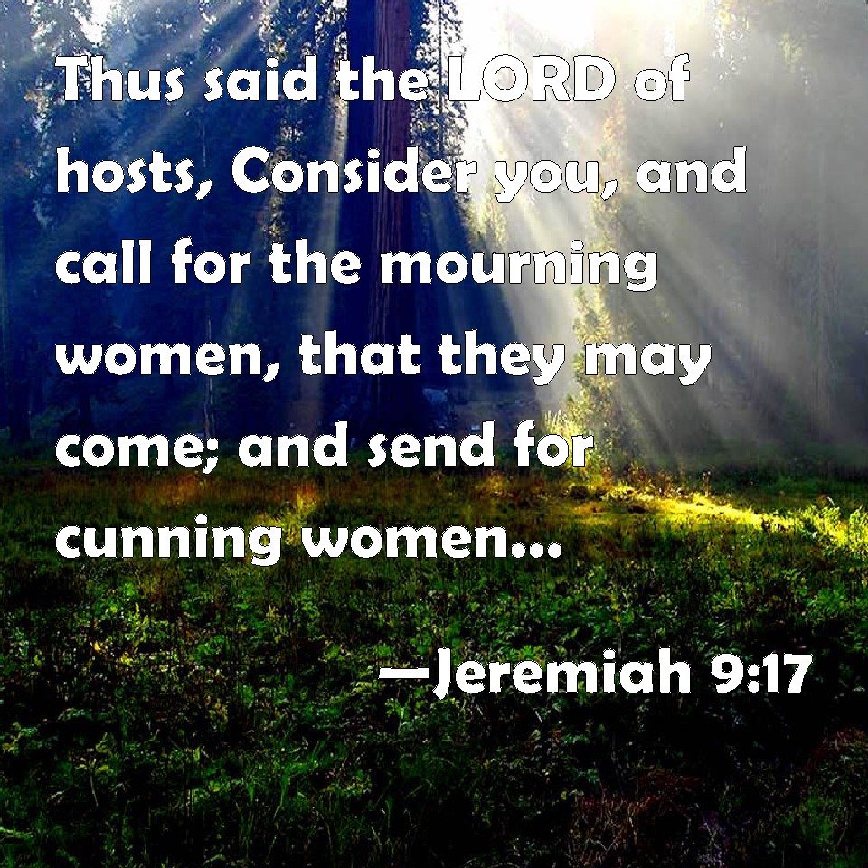 Choose a Background Jeremiah 9:17 Thus said the LORD of hosts, Consider you, and call for the mourning women, that they may come; and send for cunning women, that they may come: KJV: Thus saith the LORD of hosts, Consider ye, and call for the mourning women, that they may come; and send for cunning women, that they may come: DRB: Thus saith the Lord of hosts the God of Israel: Consider ye, and call for the mourning women, and let them come: and send to them that are wise women, and let them make haste: DBT: Thus saith Jehovah of hosts: Consider, and call for the mourning women, that they may come, and send for the skilful women, that they may come; ERV: Thus saith the LORD of hosts, Consider ye, and call for the mourning women, that they may come; and send for the cunning women, that they may come: WBT: Thus saith the LORD of hosts, Consider ye, and call for the mourning women, that they may come; and send for skillful women, that they may come: WEB: Thus says Yahweh of Armies, Consider, and call for the mourning women, that they may come; and send for the skillful women, that they may come: YLT: Thus said Jehovah of Hosts: Consider ye, and call for mourning women, And they come, And to the wise women send, and they come,Links Jeremiah 9:17 NIV • Jeremiah 9:17 NLT • Jeremiah 9:17 ESV • Jeremiah 9:17 NASB • Jeremiah 9:17 KJV • Jeremiah 9:17 Interlinear • Jeremiah 9:17 Commentaries • Jeremiah 9:17 Parallel Texts • Jeremiah 9:17 Bible Apps • Jeremiah 9:17 Parallel • Bible Hub |