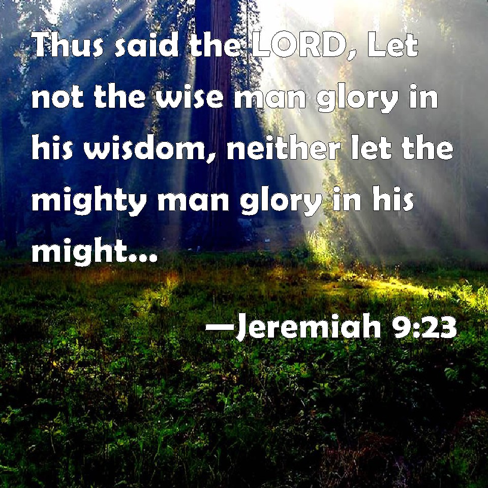 Choose a Background Jeremiah 9:23 Thus said the LORD, Let not the wise man glory in his wisdom, neither let the mighty man glory in his might, let not the rich man glory in his riches: KJV: Thus saith the LORD, Let not the wise man glory in his wisdom, neither let the mighty man glory in his might, let not the rich man glory in his riches: DRB: Thus saith the Lord: Let not the wise man glory in his wisdom, and let not the strong man glory in his strength, and let not the rich man glory in his riches: DBT: Thus saith Jehovah: Let not the wise glory in his wisdom, neither let the mighty glory in his might; let not the rich glory in his riches: ERV: Thus saith the LORD, Let not the wise man glory in his wisdom, neither let the mighty man glory in his might, let not the rich man glory in his riches: WBT: Thus saith the LORD, Let not the wise man glory in his wisdom, neither let the mighty man glory in his might, let not the rich man glory in his riches: WEB: Thus says Yahweh, Don't let the wise man glory in his wisdom, neither let the mighty man glory in his might, don't let the rich man glory in his riches; YLT: Thus said Jehovah: Let not the wise boast himself in his wisdom, Nor let the mighty boast himself in his might, Let not the rich boast himself in his riches,Links Jeremiah 9:23 NIV • Jeremiah 9:23 NLT • Jeremiah 9:23 ESV • Jeremiah 9:23 NASB • Jeremiah 9:23 KJV • Jeremiah 9:23 Interlinear • Jeremiah 9:23 Commentaries • Jeremiah 9:23 Parallel Texts • Jeremiah 9:23 Bible Apps • Jeremiah 9:23 Parallel • Bible Hub |