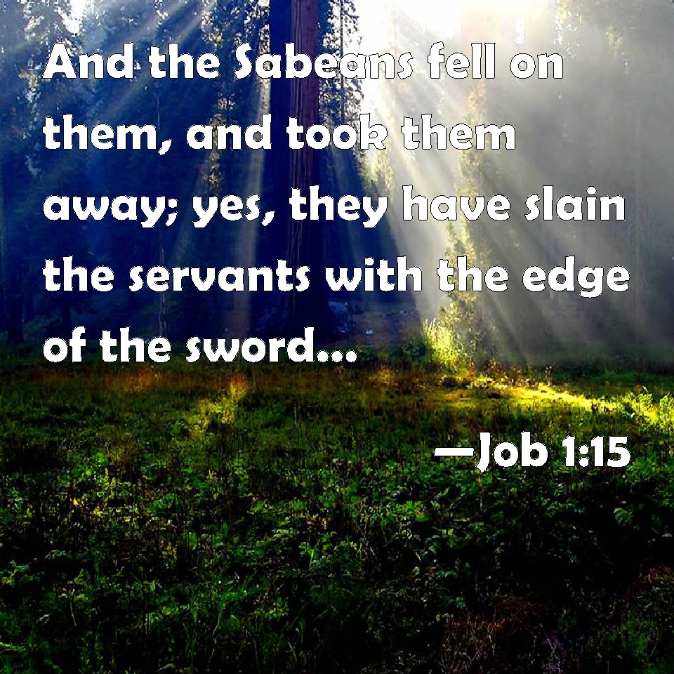 Choose a Background Job 1:15 And the Sabeans fell on them, and took them away; yes, they have slain the servants with the edge of the sword; and I only am escaped alone to tell you. KJV: And the Sabeans fell upon them, and took them away; yea, they have slain the servants with the edge of the sword; and I only am escaped alone to tell thee. DRB: And the Sabeans rushed in, and took all away, and slew the servants with the sword, and I alone have escaped to tell thee. DBT: and they of Sheba fell upon them and took them, and the servants have they smitten with the edge of the sword; and I only am escaped, alone, to tell thee. ERV: and the Sabeans fell upon them, and took them away; yea, they have slain the servants with the edge of the sword; and I only am escaped alone to tell thee. WBT: And the Sabeans fell upon them, and took them away; yes, they have slain the servants with the edge of the sword; and I only have escaped alone to tell thee. WEB: and the Sabeans attacked, and took them away. Yes, they have killed the servants with the edge of the sword, and I alone have escaped to tell you." YLT: and Sheba doth fall, and take them, and the young men they have smitten by the mouth of the sword, and I am escaped — only I alone — to declare it to thee.'Links Job 1:15 NIV • Job 1:15 NLT • Job 1:15 ESV • Job 1:15 NASB • Job 1:15 KJV • Job 1:15 Interlinear • Job 1:15 Commentaries • Job 1:15 Parallel Texts • Job 1:15 Bible Apps • Job 1:15 Parallel • Bible Hub |