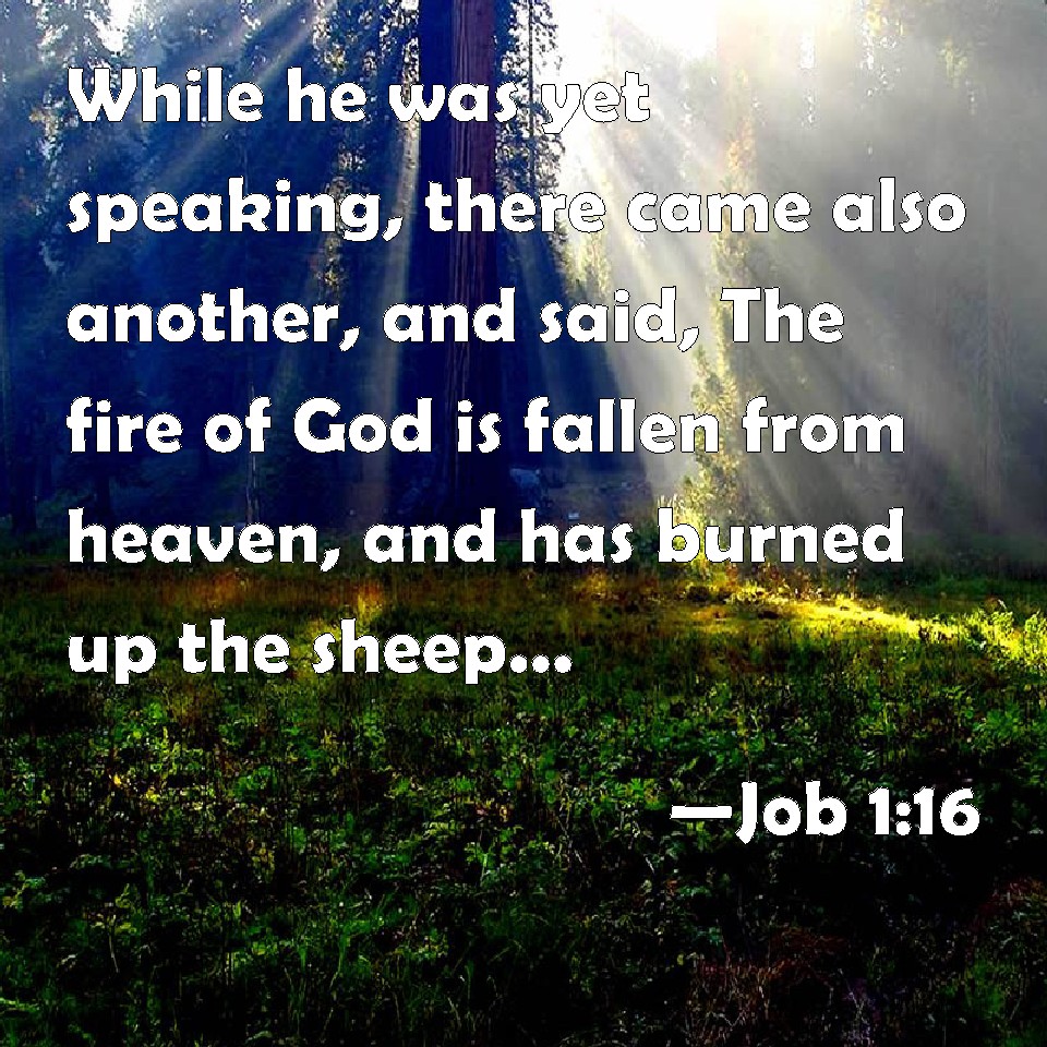 Choose a Background Job 1:16 While he was yet speaking, there came also another, and said, The fire of God is fallen from heaven, and has burned up the sheep, and the servants, and consumed them; and I only am escaped alone to tell you. KJV: While he was yet speaking, there came also another, and said, The fire of God is fallen from heaven, and hath burned up the sheep, and the servants, and consumed them; and I only am escaped alone to tell thee. DRB: And while he was yet speaking, another came, and said: The fire of God fell from heaven, and striking the sheep and the servants, hath consumed them, and I alone have escaped to tell thee. DBT: While he was yet speaking, there came another and said, The fire of God fell from heaven and burned up the sheep and the servants, and consumed them; and I only am escaped, alone, to tell thee. ERV: While he was yet speaking, there came also another, and said, The fire of God is fallen from heaven, and hath burned up the sheep, and the servants, and consumed them; and I only am escaped alone to tell thee. WBT: While he was yet speaking, there came also another, and said, The fire of God hath fallen from heaven, and hath burned up the sheep and the servants, and consumed them; and I only have escaped alone to tell thee. WEB: While he was still speaking, there also came another, and said, "The fire of God has fallen from the sky, and has burned up the sheep and the servants, and consumed them, and I alone have escaped to tell you." YLT: While this one is speaking another also hath come and saith, 'Fire of God hath fallen from the heavens, and burneth among the flock, and among the young men, and consumeth them, and I am escaped — only I alone — to declare it to thee.'Links Job 1:16 NIV • Job 1:16 NLT • Job 1:16 ESV • Job 1:16 NASB • Job 1:16 KJV • Job 1:16 Interlinear • Job 1:16 Commentaries • Job 1:16 Parallel Texts • Job 1:16 Bible Apps • Job 1:16 Parallel • Bible Hub |