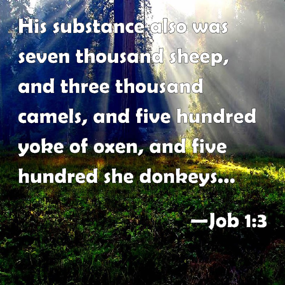 Choose a Background Job 1:3 His substance also was seven thousand sheep, and three thousand camels, and five hundred yoke of oxen, and five hundred she asses, and a very great household; so that this man was the greatest of all the men of the east. KJV: His substance also was seven thousand sheep, and three thousand camels, and five hundred yoke of oxen, and five hundred she asses, and a very great household; so that this man was the greatest of all the men of the east. DRB: And his possession was seven thousand sheep, and three thousand camels, and five hundred yoke of oxen, and five hundred she asses, and a family exceeding great: and this man was great among all the people of the east. DBT: And his substance was seven thousand sheep, and three thousand camels, and five hundred yoke of oxen, and five hundred she-asses, and very many servants; and this man was greater than all the children of the east. ERV: His substance also was seven thousand sheep, and three thousand camels, and five hundred yoke of oxen, and five hundred she-asses, and a very great household; so that this man was the greatest of all the children of the east. WBT: His substance also was seven thousand sheep, and three thousand camels, and five hundred yoke of oxen, and five hundred she-asses, and a very great household; so that this man was the greatest of all the men of the east. WEB: His possessions also were seven thousand sheep, three thousand camels, five hundred yoke of oxen, five hundred female donkeys, and a very great household; so that this man was the greatest of all the children of the east. YLT: and his substance is seven thousand sheep, and three thousand camels, and five hundred pairs of oxen, and five hundred she-asses, and a service very abundant; and that man is greater than any of the sons of the east.Links Job 1:3 NIV • Job 1:3 NLT • Job 1:3 ESV • Job 1:3 NASB • Job 1:3 KJV • Job 1:3 Interlinear • Job 1:3 Commentaries • Job 1:3 Parallel Texts • Job 1:3 Bible Apps • Job 1:3 Parallel • Bible Hub |
