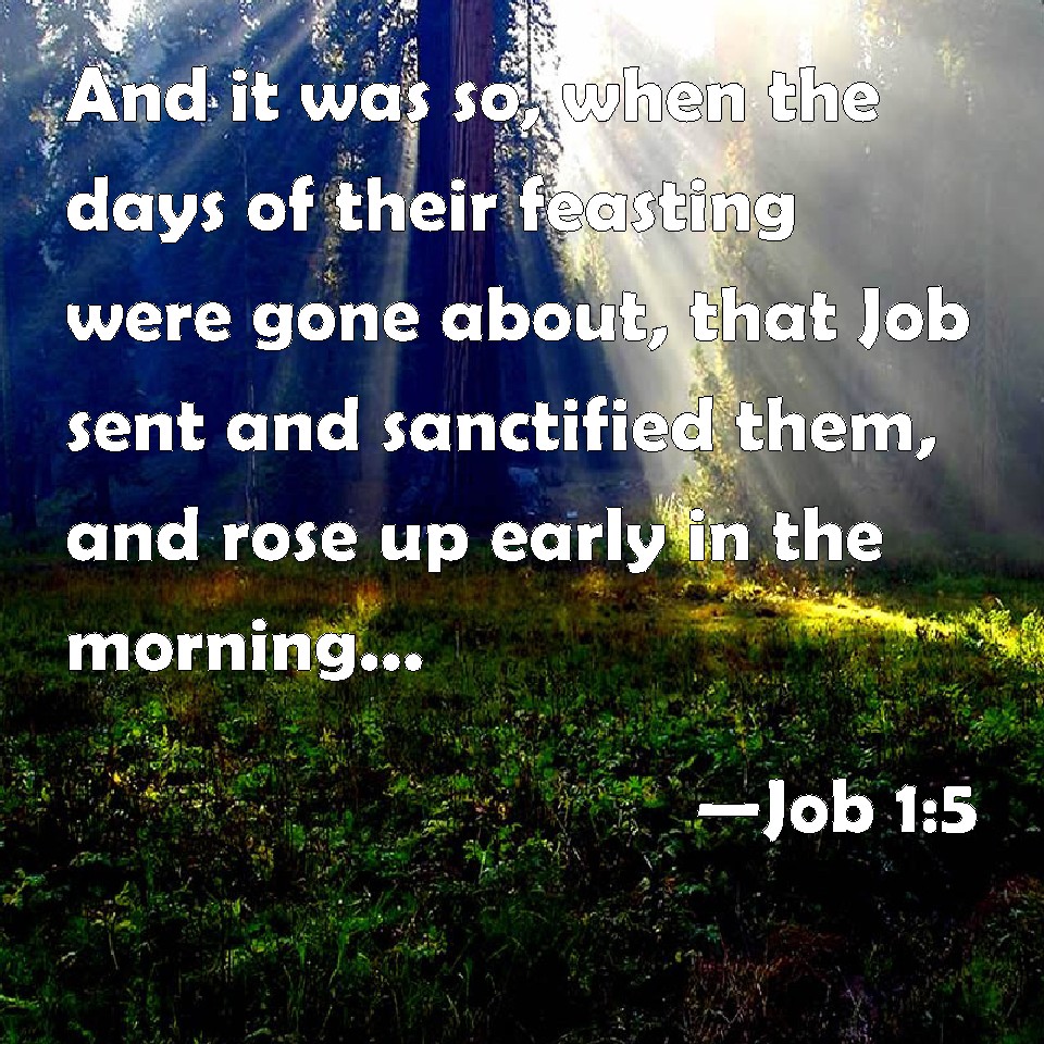 Choose a Background Job 1:5 And it was so, when the days of their feasting were gone about, that Job sent and sanctified them, and rose up early in the morning, and offered burnt offerings according to the number of them all: for Job said, It may be that my sons have sinned, and cursed God in their hearts. Thus did Job continually. KJV: And it was so, when the days of their feasting were gone about, that Job sent and sanctified them, and rose up early in the morning, and offered burnt offerings according to the number of them all: for Job said, It may be that my sons have sinned, and cursed God in their hearts. Thus did Job continually. DRB: And when the days of their feasting were gone about, Job sent to them, and sanctified them: and rising up early offered holocausts for every one of them. For he said: Lest perhaps my sons have sinned, and have blessed God in their hearts. So did Job all days. DBT: And it was so, when the days of the feasting were gone about, that Job sent and hallowed them; and he rose up early in the morning, and offered up burnt-offerings according to the number of them all; for Job said, It may be that my children have sinned, and cursed God in their hearts. Thus did Job continually. ERV: And it was so, when the days of their feasting were gone about, that Job sent and sanctified them, and rose up early in the morning, and offered burn offerings according to the number of them all: for Job said, It may be that my sons have sinned, and renounced God in their hearts. Thus did Job continually. WBT: And it was so, when the days of their feasting were ended, that Job sent and sanctified them, and rose early in the morning, and offered burnt-offerings according to the number of them all; for Job said, It may be that my sons have sinned, and cursed God in their hearts. Thus did Job continually. WEB: It was so, when the days of their feasting had run their course, that Job sent and sanctified them, and rose up early in the morning, and offered burnt offerings according to the number of them all. For Job said, "It may be that my sons have sinned, and renounced God in their hearts." Job did so continually. YLT: and it cometh to pass, when they have gone round the days of the banquet, that Job doth send and sanctify them, and hath risen early in the morning, and caused to ascend burnt-offerings — the number of them all — for Job said, 'Perhaps my sons have sinned, yet blessed God in their heart.' Thus doth Job all the days.Links Job 1:5 NIV • Job 1:5 NLT • Job 1:5 ESV • Job 1:5 NASB • Job 1:5 KJV • Job 1:5 Interlinear • Job 1:5 Commentaries • Job 1:5 Parallel Texts • Job 1:5 Bible Apps • Job 1:5 Parallel • Bible Hub |