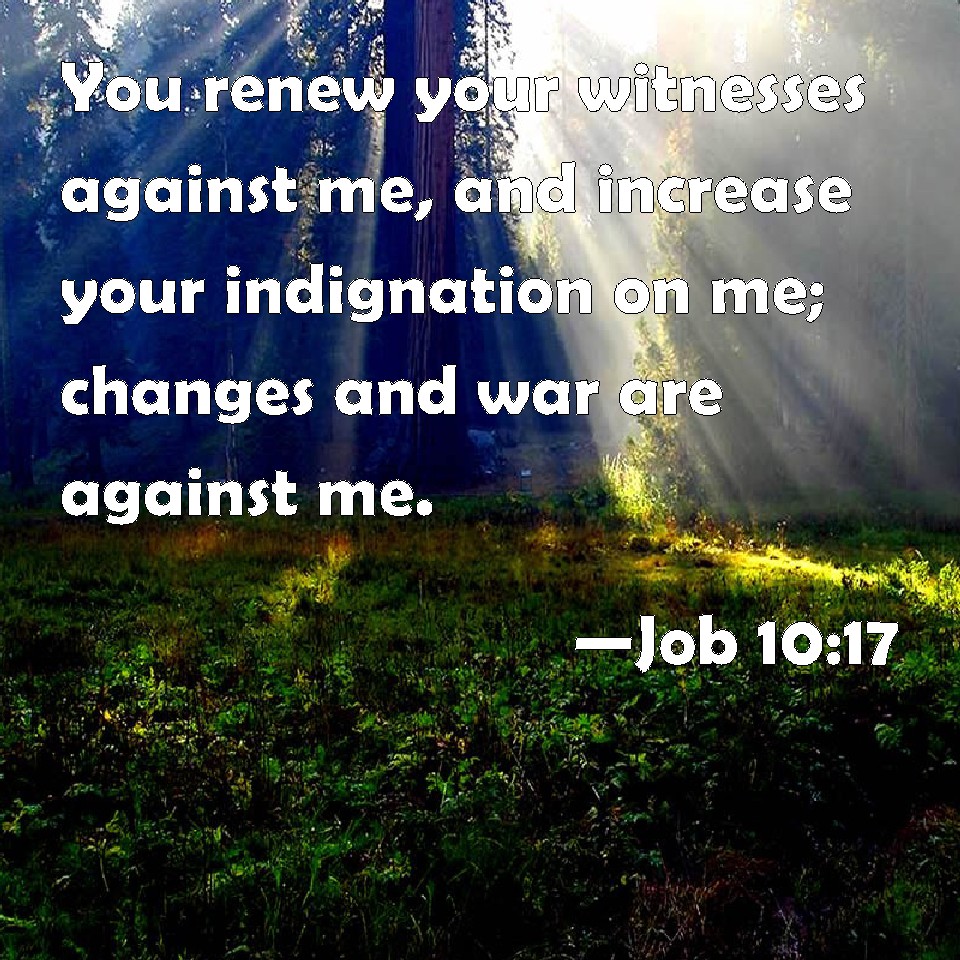 Job 10:17 You renew your witnesses against me, and increase your indignation on me; changes and war are against me.