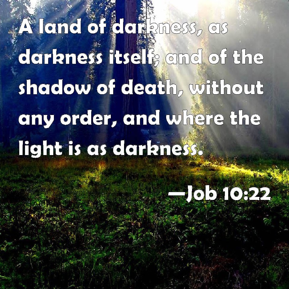 Choose a Background Job 10:22 A land of darkness, as darkness itself; and of the shadow of death, without any order, and where the light is as darkness. KJV: A land of darkness, as darkness itself; and of the shadow of death, without any order, and where the light is as darkness. DRB: A land of misery and darkness, where the shadow of death, and no order, but everlasting horror dwelleth. DBT: A land of gloom, as darkness itself; of the shadow of death, without any order, where the light is as thick darkness. ERV: A land of thick darkness, as darkness itself; a land of the shadow of death, without any order, and where the light is as darkness. WBT: A land of darkness, as darkness itself; and of the shades of death, without any order, and where the light is as darkness. WEB: the land dark as midnight, of the shadow of death, without any order, where the light is as midnight.'" YLT: A land of obscurity as thick darkness, Death-shade — and no order, And the shining is as thick darkness.'Links Job 10:22 NIV • Job 10:22 NLT • Job 10:22 ESV • Job 10:22 NASB • Job 10:22 KJV • Job 10:22 Interlinear • Job 10:22 Commentaries • Job 10:22 Parallel Texts • Job 10:22 Bible Apps • Job 10:22 Parallel • Bible Hub |