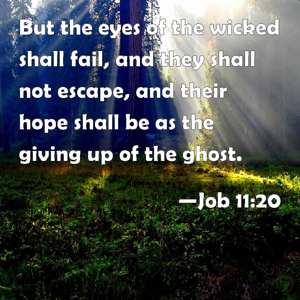 Choose a Background Job 11:20 But the eyes of the wicked shall fail, and they shall not escape, and their hope shall be as the giving up of the ghost. KJV: But the eyes of the wicked shall fail, and they shall not escape, and their hope shall be as the giving up of the ghost. DRB: But the eyes of the wicked shall decay, and the way to escape shall fail them, and their hope the abomination of the soul. DBT: But the eyes of the wicked shall fail, and all refuge shall vanish from them, and their hope shall be the breathing out of life. ERV: But the eyes of the wicked shall fail, and they shall have no way to flee, and their hope shall be the giving up of the ghost. WBT: But the eyes of the wicked shall fail, and they shall not escape, and their hope shall be as the expiration of the breath. WEB: But the eyes of the wicked shall fail. They shall have no way to flee. Their hope shall be the giving up of the spirit." YLT: And the eyes of the wicked are consumed, And refuge hath perished from them, And their hope is a breathing out of soul!Links Job 11:20 NIV • Job 11:20 NLT • Job 11:20 ESV • Job 11:20 NASB • Job 11:20 KJV • Job 11:20 Interlinear • Job 11:20 Commentaries • Job 11:20 Parallel Texts • Job 11:20 Bible Apps • Job 11:20 Parallel • Bible Hub |