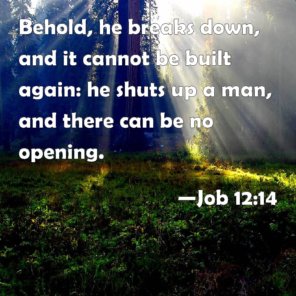 Choose a Background Job 12:14 Behold, he breaks down, and it cannot be built again: he shuts up a man, and there can be no opening. KJV: Behold, he breaketh down, and it cannot be built again: he shutteth up a man, and there can be no opening. DRB: If he pull down, there is no man that can build up: if he shut up a. man, there is none that can open. DBT: Behold, he breaketh down, and it is not built again; he shutteth up a man, and there is no opening. ERV: Behold, he breaketh down, and it cannot be built again; he shutteth up a man, and there can be no opening. WBT: Behold, he breaketh down, and it cannot be built again: he shutteth up a man, and there can be no opening. WEB: Behold, he breaks down, and it can't be built again. He imprisons a man, and there can be no release. YLT: Lo, He breaketh down, and it is not built up, He shutteth against a man, And it is not opened.Links Job 12:14 NIV • Job 12:14 NLT • Job 12:14 ESV • Job 12:14 NASB • Job 12:14 KJV • Job 12:14 Interlinear • Job 12:14 Commentaries • Job 12:14 Parallel Texts • Job 12:14 Bible Apps • Job 12:14 Parallel • Bible Hub |