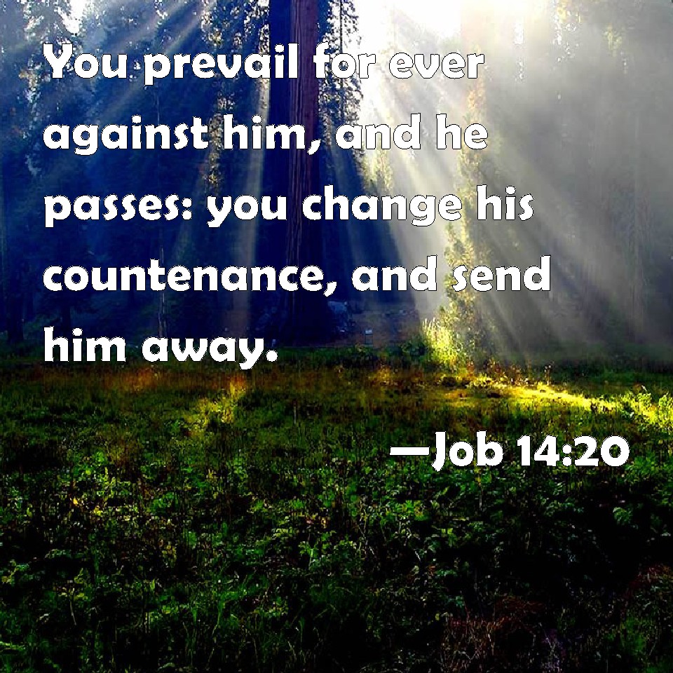 Choose a Background Job 14:20 You prevail for ever against him, and he passes: you change his countenance, and send him away. KJV: Thou prevailest for ever against him, and he passeth: thou changest his countenance, and sendest him away. DRB: Thou hast strengthened him for a little while, that he may pass away for ever: thou shalt change his face, and shalt send him away. DBT: Thou prevailest for ever against him, and he passeth away; thou changest his countenance, and dismissest him. ERV: Thou prevailest for ever against him, and he passeth; thou changest his countenance, and sendest him away. WBT: Thou prevailest for ever against him, and he passeth: thou changest his countenance, and sendest him away. WEB: You forever prevail against him, and he departs. You change his face, and send him away. YLT: Thou prevailest over him for ever, and he goeth, He is changing his countenance, And Thou sendest him away.Links Job 14:20 NIV • Job 14:20 NLT • Job 14:20 ESV • Job 14:20 NASB • Job 14:20 KJV • Job 14:20 Interlinear • Job 14:20 Commentaries • Job 14:20 Parallel Texts • Job 14:20 Bible Apps • Job 14:20 Parallel • Bible Hub |