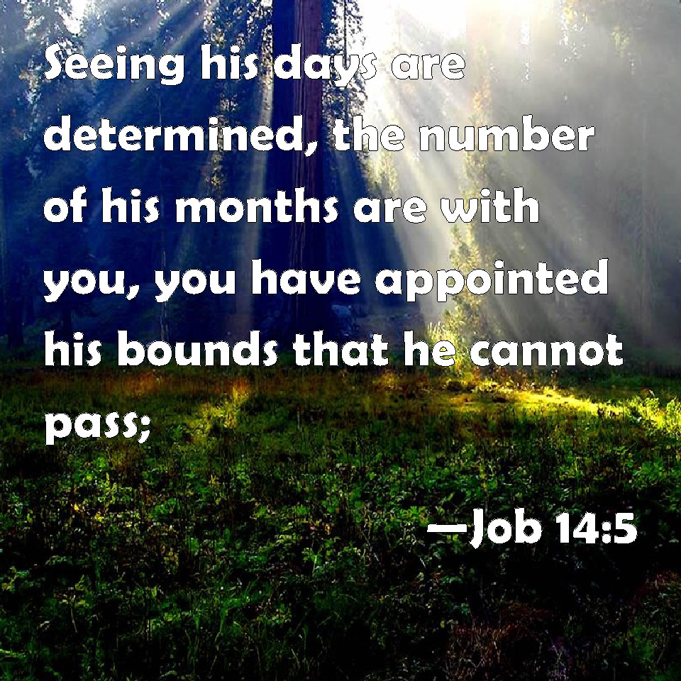 Choose a Background Job 14:5 Seeing his days are determined, the number of his months are with you, you have appointed his bounds that he cannot pass; KJV: Seeing his days are determined, the number of his months are with thee, thou hast appointed his bounds that he cannot pass; DRB: The days of man are short, and the number of his months is with thee: thou hast appointed his bounds which cannot be passed. DBT: If his days are determined, if the number of his months is with thee, and thou hast appointed his bounds which he must not pass, ERV: Seeing his days are determined, the number of his months is with thee, and thou hast appointed his bounds that he cannot pass; WBT: Seeing his days are determined, the number of his months is with thee, thou hast appointed his bounds that he cannot pass; WEB: Seeing his days are determined, the number of his months is with you, and you have appointed his bounds that he can't pass; YLT: If determined are his days, The number of his months are with Thee, His limit Thou hast made, And he passeth not over;Links Job 14:5 NIV • Job 14:5 NLT • Job 14:5 ESV • Job 14:5 NASB • Job 14:5 KJV • Job 14:5 Interlinear • Job 14:5 Commentaries • Job 14:5 Parallel Texts • Job 14:5 Bible Apps • Job 14:5 Parallel • Bible Hub |