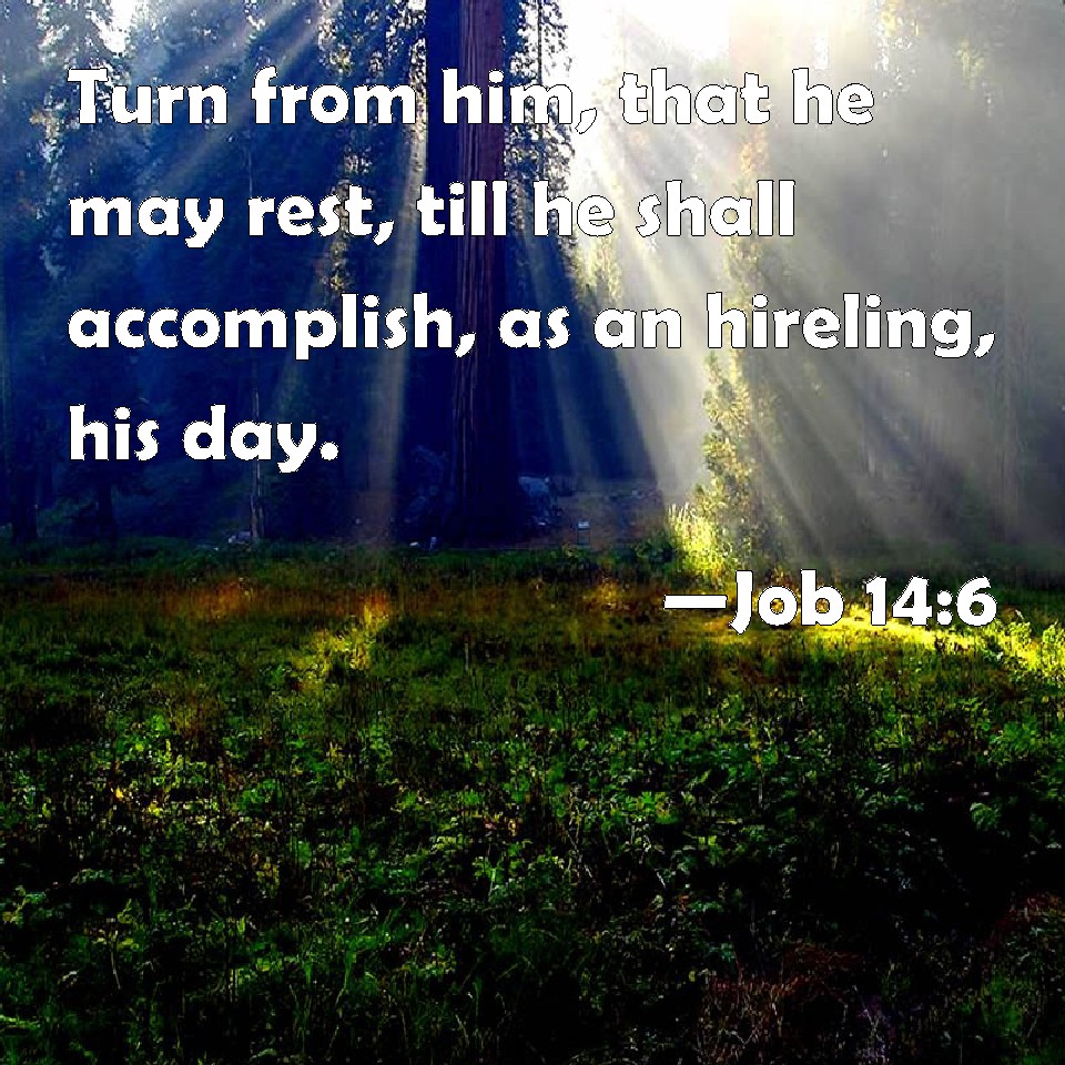 Choose a Background Job 14:6 Turn from him, that he may rest, till he shall accomplish, as an hireling, his day. KJV: Turn from him, that he may rest, till he shall accomplish, as an hireling, his day. DRB: Depart a little from him, that he may rest, until his wished for day come, as that of the hireling. DBT: Look away from him; and let him rest, till he accomplish, as a hireling, his day. ERV: Look away from him, that he may rest, till he shall accomplish, as an hireling, his day. WBT: Turn from him, that he may rest, till he shall accomplish, as a hireling, his day. WEB: Look away from him, that he may rest, until he shall accomplish, as a hireling, his day. YLT: Look away from off him that he may cease, Till he enjoy as an hireling his day.Links Job 14:6 NIV • Job 14:6 NLT • Job 14:6 ESV • Job 14:6 NASB • Job 14:6 KJV • Job 14:6 Interlinear • Job 14:6 Commentaries • Job 14:6 Parallel Texts • Job 14:6 Bible Apps • Job 14:6 Parallel • Bible Hub |
