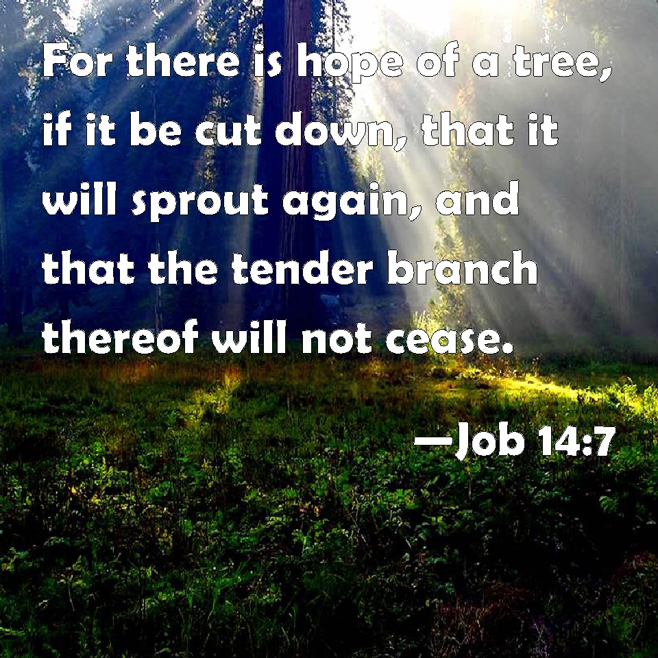 Choose a Background Job 14:7 For there is hope of a tree, if it be cut down, that it will sprout again, and that the tender branch thereof will not cease. KJV: For there is hope of a tree, if it be cut down, that it will sprout again, and that the tender branch thereof will not cease. DRB: A tree hath hope: if it be cut, it groweth green again, and the boughs thereof sprout. DBT: For there is hope for a tree: if it be cut down, it will sprout again, and its tender branch will not cease; ERV: For there is hope of a tree, if it be cut down, that it will sprout again, and that the tender branch thereof will not cease. WBT: For there is hope of a tree, if it is cut down, that it will sprout again, and that its tender branch will not cease. WEB: "For there is hope for a tree, If it is cut down, that it will sprout again, that the tender branch of it will not cease. YLT: For there is of a tree hope, if it be cut down, That again it doth change, That its tender branch doth not cease.Links Job 14:7 NIV • Job 14:7 NLT • Job 14:7 ESV • Job 14:7 NASB • Job 14:7 KJV • Job 14:7 Interlinear • Job 14:7 Commentaries • Job 14:7 Parallel Texts • Job 14:7 Bible Apps • Job 14:7 Parallel • Bible Hub |