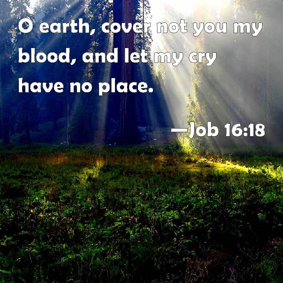 Choose a Background Job 16:18 O earth, cover not you my blood, and let my cry have no place. KJV: O earth, cover not thou my blood, and let my cry have no place. DRB: O earth, cover not thou my blood, neither let my cry find a hiding place in thee. DBT: O earth, cover not my blood, and let there be no place for my cry! ERV: O earth, cover not thou my blood, and let my cry have no resting place. WBT: O earth, cover not thou my blood, and let my cry have no place. WEB: "Earth, don't cover my blood. Let my cry have no place to rest. YLT: O earth, do not thou cover my blood! And let there not be a place for my cry.Links Job 16:18 NIV • Job 16:18 NLT • Job 16:18 ESV • Job 16:18 NASB • Job 16:18 KJV • Job 16:18 Interlinear • Job 16:18 Commentaries • Job 16:18 Parallel Texts • Job 16:18 Bible Apps • Job 16:18 Parallel • Bible Hub |