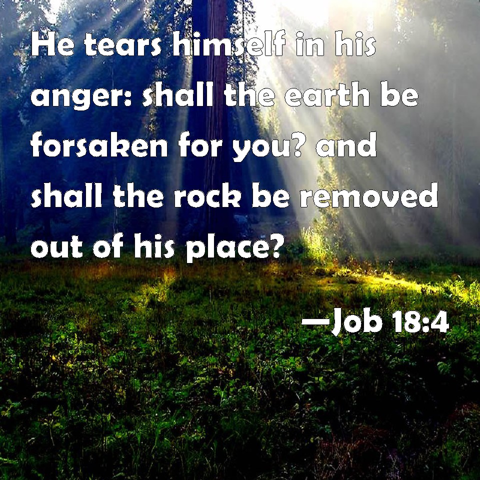 Job 18:4 He tears himself in his anger: shall the earth be forsaken for you? and shall the rock be removed out of his place?