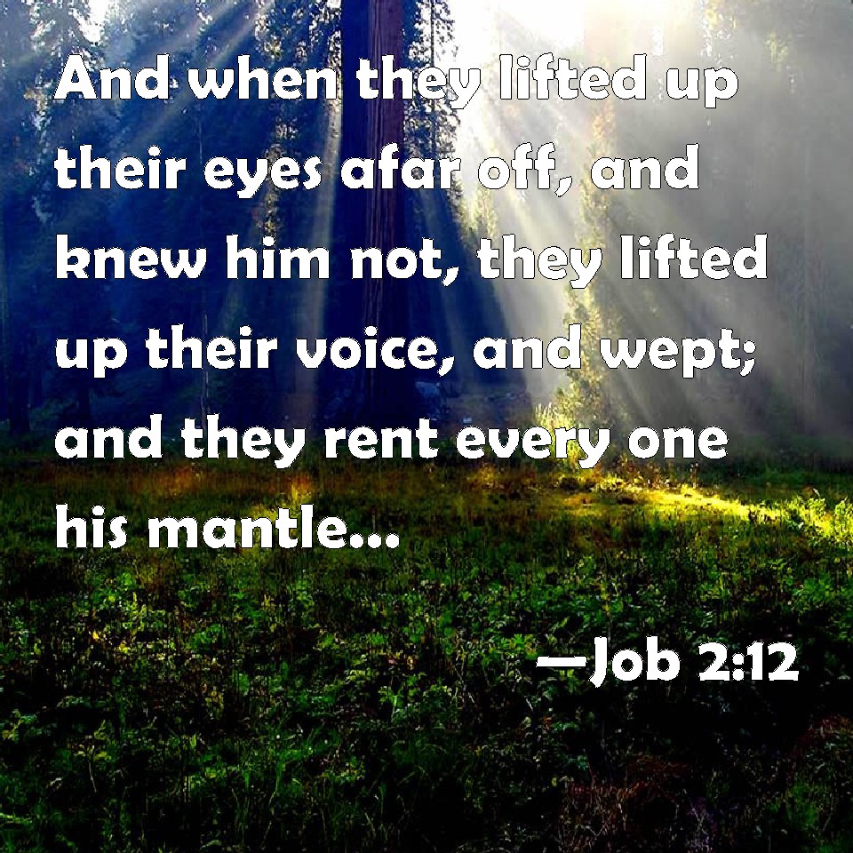 Choose a Background Job 2:12 And when they lifted up their eyes afar off, and knew him not, they lifted up their voice, and wept; and they rent every one his mantle, and sprinkled dust on their heads toward heaven. KJV: And when they lifted up their eyes afar off, and knew him not, they lifted up their voice, and wept; and they rent every one his mantle, and sprinkled dust upon their heads toward heaven. DRB: And when they had lifted up their eyes afar off, they knew him not, and crying out they wept, and rending their garments they sprinkled dust upon their heads towards heaven. DBT: And when they lifted up their eyes afar off, and knew him not, they lifted up their voice and wept. And they rent every one his mantle, and sprinkled dust upon their heads toward the heavens. ERV: And when they lifted up their eyes afar off, and knew him not, they lifted up their voice, and wept; and they rent every one his mantle, and sprinkled dust upon their heads toward heaven. WBT: And when they lifted up their eyes afar off, and knew him not, they raised their voice, and wept; and they rent every one his mantle, and sprinkled dust upon their heads towards heaven. WEB: When they lifted up their eyes from a distance, and didn't recognize him, they raised their voices, and wept; and they each tore his robe, and sprinkled dust on their heads toward the sky. YLT: and they lift up their eyes from afar and have not discerned him, and they lift up their voice and weep, and rend each his robe, and sprinkle dust on their heads — heavenward.Links Job 2:12 NIV • Job 2:12 NLT • Job 2:12 ESV • Job 2:12 NASB • Job 2:12 KJV • Job 2:12 Interlinear • Job 2:12 Commentaries • Job 2:12 Parallel Texts • Job 2:12 Bible Apps • Job 2:12 Parallel • Bible Hub |