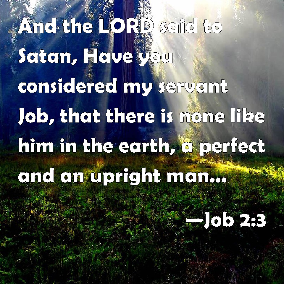 Choose a Background Job 2:3 And the LORD said to Satan, Have you considered my servant Job, that there is none like him in the earth, a perfect and an upright man, one that fears God, and eschews evil? and still he holds fast his integrity, although you moved me against him, to destroy him without cause. KJV: And the LORD said unto Satan, Hast thou considered my servant Job, that there is none like him in the earth, a perfect and an upright man, one that feareth God, and escheweth evil? and still he holdeth fast his integrity, although thou movedst me against him, to destroy him without cause. DRB: And the Lord said to Satan: Hast thou considered my servant Job, that there is none like him in the earth, a man simple, and upright, and fearing Cod, and avoiding evil, and still keeping his innocence ? But thou hast moved me against him, that I sho uld afflict him without cause. DBT: And Jehovah said to Satan, Hast thou considered my servant Job, that there is none like him on the earth, a perfect and an upright man, one that feareth God and abstaineth from evil? and still he remaineth firm in his integrity, though thou movedst me against him, to swallow him up without cause. ERV: And the LORD said unto Satan, Hast thou considered my servant Job? for there is none like him in the earth, a perfect and art upright man, one that feareth God, and escheweth evil: and he still holdeth fast his integrity, although thou movedst me against him, to destroy him without cause. WBT: And the LORD said to Satan, Hast thou considered my servant Job, that there is none like him on the earth, a perfect and an upright man, one that feareth God, and shunneth evil? and still he holdeth fast his integrity, although thou movedst me against him, to destroy him without cause. WEB: Yahweh said to Satan, "Have you considered my servant Job? For there is none like him in the earth, a blameless and an upright man, one who fears God, and turns away from evil. He still maintains his integrity, although you incited me against him, to ruin him without cause." YLT: And Jehovah saith unto the Adversary, 'Hast thou set thy heart unto My servant Job because there is none like him in the land, a man perfect and upright, fearing God and turning aside from evil? and still he is keeping hold on his integrity, and thou dost move Me against him to swallow him up for nought!'Links Job 2:3 NIV • Job 2:3 NLT • Job 2:3 ESV • Job 2:3 NASB • Job 2:3 KJV • Job 2:3 Interlinear • Job 2:3 Commentaries • Job 2:3 Parallel Texts • Job 2:3 Bible Apps • Job 2:3 Parallel • Bible Hub |