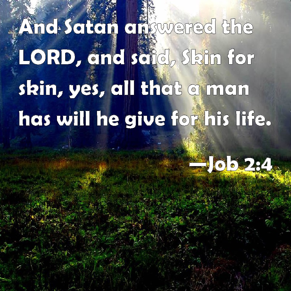 Choose a Background Job 2:4 And Satan answered the LORD, and said, Skin for skin, yes, all that a man has will he give for his life. KJV: And Satan answered the LORD, and said, Skin for skin, yea, all that a man hath will he give for his life. DRB: And Satan answered, and said: Skin for skin, and all that a man hath he will give for his life: DBT: And Satan answered Jehovah and said, Skin for skin, yea, all that a man hath will he give for his life; ERV: And Satan answered the LORD, and said, Skin for skin, yea, all that a man hath will he give for his life. WBT: And Satan answered the LORD, and said, Skin for skin, even, all that a man hath will he give for his life. WEB: Satan answered Yahweh, and said, "Skin for skin. Yes, all that a man has he will give for his life. YLT: And the Adversary answereth Jehovah and saith, 'A skin for a skin, and all that a man hath he doth give for his life.Links Job 2:4 NIV • Job 2:4 NLT • Job 2:4 ESV • Job 2:4 NASB • Job 2:4 KJV • Job 2:4 Interlinear • Job 2:4 Commentaries • Job 2:4 Parallel Texts • Job 2:4 Bible Apps • Job 2:4 Parallel • Bible Hub |