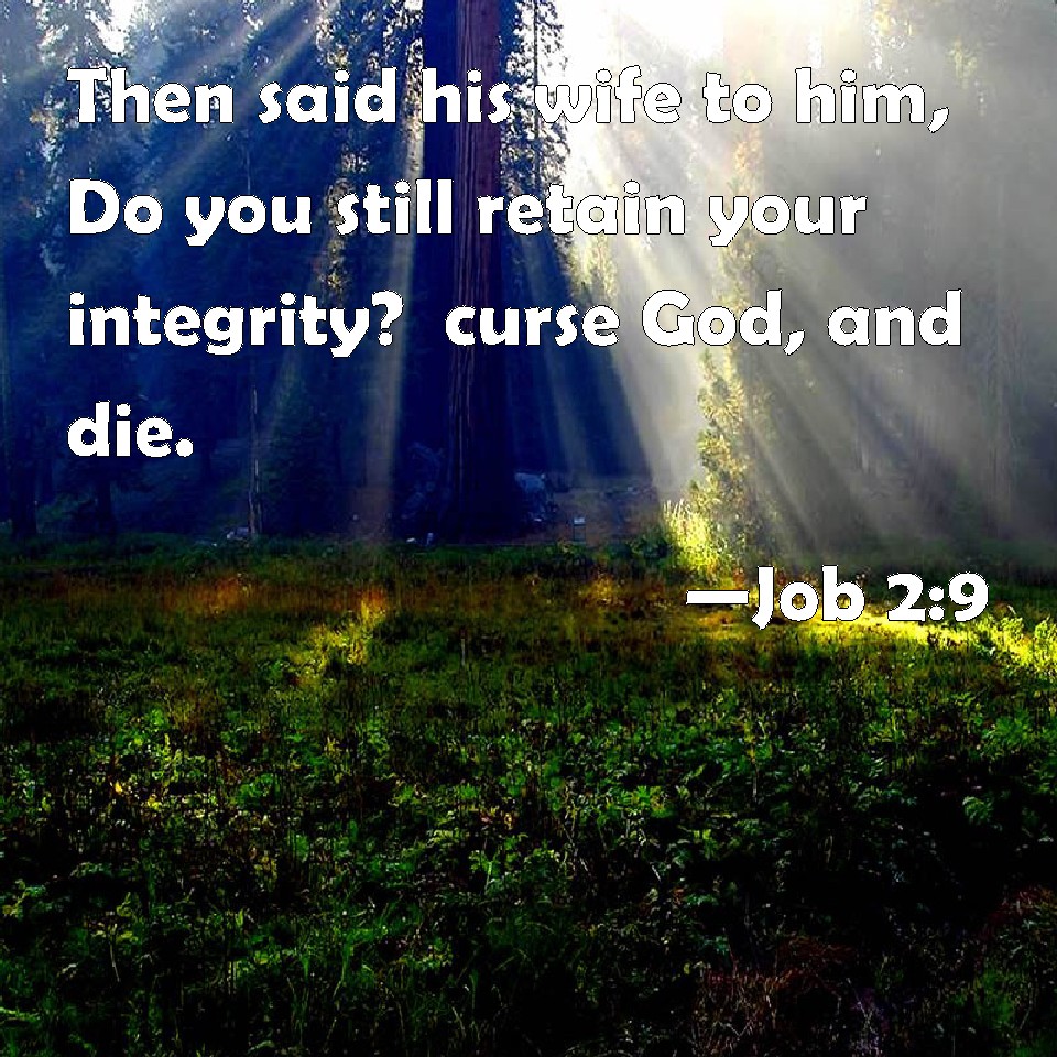 Choose a Background Job 2:9 Then said his wife to him, Do you still retain your integrity? curse God, and die. KJV: Then said his wife unto him, Dost thou still retain thine integrity? curse God, and die. DRB: And his wife said to him: Dost thou still continue in thy simplicity? bless God and die. DBT: And his wife said to him, Dost thou still remain firm in thine integrity? curse God and die. ERV: Then said his wife unto him, Dost thou still hold fast thine integrity? renounce God, and die. WBT: Then said his wife to him, Dost thou still retain thy integrity? curse God, and die. WEB: Then his wife said to him, "Do you still maintain your integrity? Renounce God, and die." YLT: And his wife saith to him, 'Still thou art keeping hold on thine integrity: bless God and die.'Links Job 2:9 NIV • Job 2:9 NLT • Job 2:9 ESV • Job 2:9 NASB • Job 2:9 KJV • Job 2:9 Interlinear • Job 2:9 Commentaries • Job 2:9 Parallel Texts • Job 2:9 Bible Apps • Job 2:9 Parallel • Bible Hub |