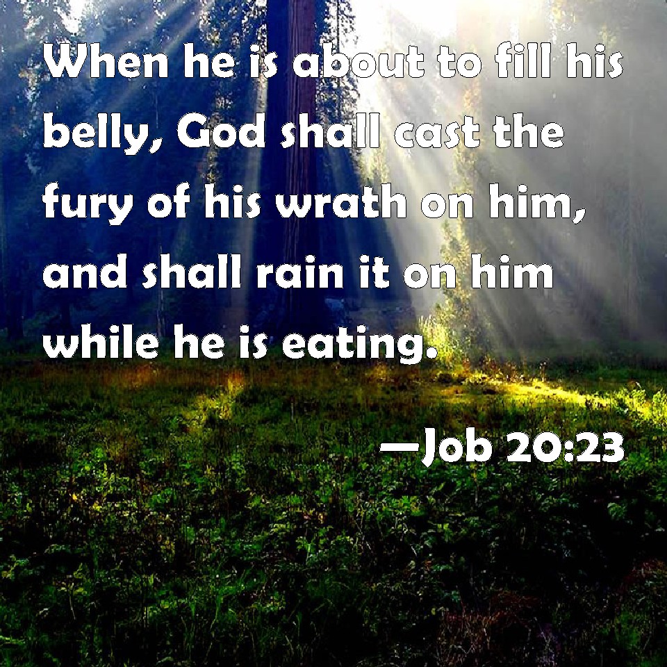 Choose a Background Job 20:23 When he is about to fill his belly, God shall cast the fury of his wrath on him, and shall rain it on him while he is eating. KJV: When he is about to fill his belly, God shall cast the fury of his wrath upon him, and shall rain it upon him while he is eating. DRB: May his belly be filled, that God may send forth the wrath of his indignation upon him, and rain down his war upon him. DBT: It shall be that, to fill his belly, he will cast his fierce anger upon him, and will rain it upon him into his flesh. ERV: When he is about to fill his belly, God shall cast the fierceness of his wrath upon him, and shall rain it upon him while he is eating. WBT: When he is about to fill his belly, God shall cast the fury of his wrath upon him, and shall rain it upon him while he is eating. WEB: When he is about to fill his belly, God will cast the fierceness of his wrath on him. It will rain on him while he is eating. YLT: It cometh to pass, at the filling of his belly, He sendeth forth against him The fierceness of His anger, Yea, He raineth on him in his eating.Links Job 20:23 NIV • Job 20:23 NLT • Job 20:23 ESV • Job 20:23 NASB • Job 20:23 KJV • Job 20:23 Interlinear • Job 20:23 Commentaries • Job 20:23 Parallel Texts • Job 20:23 Bible Apps • Job 20:23 Parallel • Bible Hub |