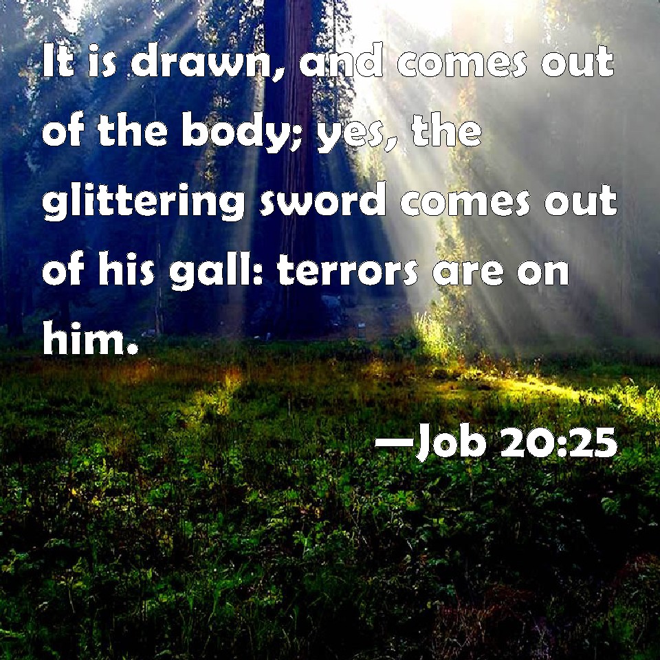 Choose a Background Job 20:25 It is drawn, and comes out of the body; yes, the glittering sword comes out of his gall: terrors are on him. KJV: It is drawn, and cometh out of the body; yea, the glittering sword cometh out of his gall: terrors are upon him. DRB: The sword is drawn out, and cometh forth from its scabbard, and glittereth in his bitterness: the terrible ones shall go and come upon him. DBT: He draweth it forth; it cometh out of his body, and the glittering point out of his gall: terrors are upon him. ERV: He draweth it forth, and it cometh out of his body: yea, the glittering point cometh out of his gall; terrors are upon him. WBT: It is drawn, and cometh out of the body; yes, the glittering sword cometh out of his gall: terrors are upon him. WEB: He draws it forth, and it comes out of his body. Yes, the glittering point comes out of his liver. Terrors are on him. YLT: One hath drawn, And it cometh out from the body, And a glittering weapon from his gall proceedeth. On him are terrors.Links Job 20:25 NIV • Job 20:25 NLT • Job 20:25 ESV • Job 20:25 NASB • Job 20:25 KJV • Job 20:25 Interlinear • Job 20:25 Commentaries • Job 20:25 Parallel Texts • Job 20:25 Bible Apps • Job 20:25 Parallel • Bible Hub |