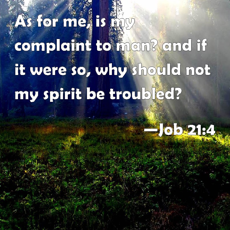 Choose a Background Job 21:4 As for me, is my complaint to man? and if it were so, why should not my spirit be troubled? KJV: As for me, is my complaint to man? and if it were so, why should not my spirit be troubled? DRB: Is my debate against man, that I should not have just reason to be troubled? DBT: As for me, is my complaint to a man? or wherefore should not my spirit be impatient? ERV: As for me, is my complaint to man? and why should I not be impatient? WBT: As for me, is my complaint to man? and if it were so, why should not my spirit be troubled? WEB: As for me, is my complaint to man? Why shouldn't I be impatient? YLT: I — to man is my complaint? and if so, wherefore May not my temper become short?Links Job 21:4 NIV • Job 21:4 NLT • Job 21:4 ESV • Job 21:4 NASB • Job 21:4 KJV • Job 21:4 Interlinear • Job 21:4 Commentaries • Job 21:4 Parallel Texts • Job 21:4 Bible Apps • Job 21:4 Parallel • Bible Hub |