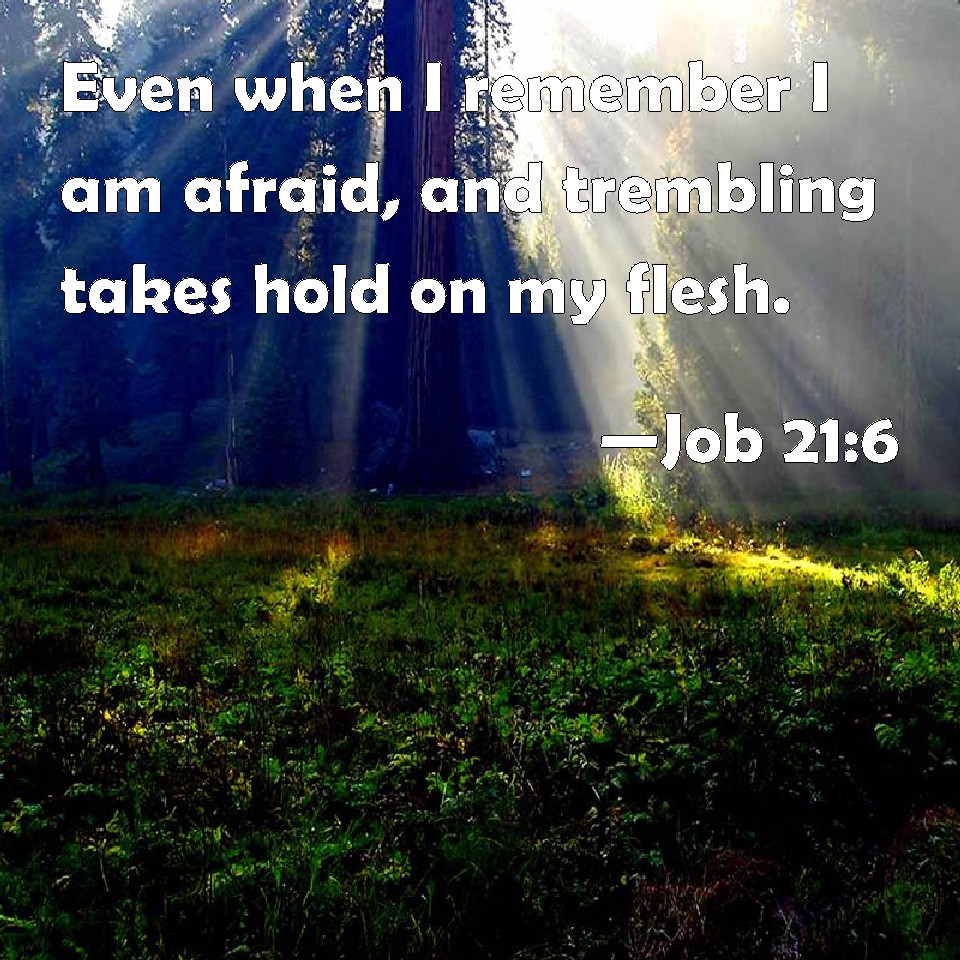 Choose a Background Job 21:6 Even when I remember I am afraid, and trembling takes hold on my flesh. KJV: Even when I remember I am afraid, and trembling taketh hold on my flesh. DRB: As for me, when I remember, I am afraid, and trembling taketh hold on my flesh. DBT: Even when I think thereon, I am affrighted, and trembling taketh hold of my flesh. ERV: Even when I remember I am troubled, and horror taketh hold on my flesh. WBT: Even when I remember I am afraid, and trembling taketh hold on my flesh. WEB: When I remember, I am troubled. Horror takes hold of my flesh. YLT: Yea, if I have remembered, then I have been troubled. And my flesh hath taken fright.Links Job 21:6 NIV • Job 21:6 NLT • Job 21:6 ESV • Job 21:6 NASB • Job 21:6 KJV • Job 21:6 Interlinear • Job 21:6 Commentaries • Job 21:6 Parallel Texts • Job 21:6 Bible Apps • Job 21:6 Parallel • Bible Hub |
