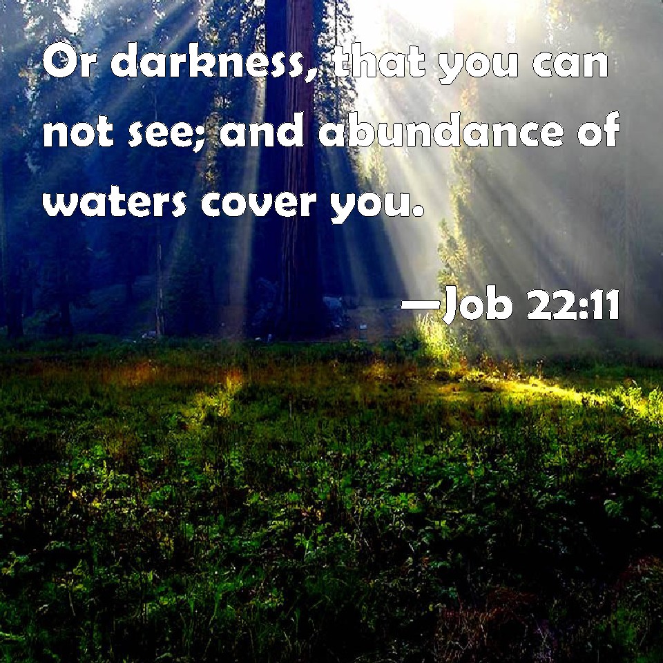 Choose a Background Job 22:11 Or darkness, that you can not see; and abundance of waters cover you. KJV: Or darkness, that thou canst not see; and abundance of waters cover thee. DRB: And didst thou think that thou shouldst not see darkness, and that thou shouldst not be covered with the violence of overflowing waters? DBT: Or darkness, that thou canst not see, and floods of waters cover thee. ERV: Or darkness, that thou canst not see, and abundance of waters cover thee. WBT: Or darkness, that thou canst not see; and abundance of waters cover thee. WEB: or darkness, so that you can not see, and floods of waters cover you. YLT: Or darkness — thou dost not see, And abundance of waters doth cover thee.Links Job 22:11 NIV • Job 22:11 NLT • Job 22:11 ESV • Job 22:11 NASB • Job 22:11 KJV • Job 22:11 Interlinear • Job 22:11 Commentaries • Job 22:11 Parallel Texts • Job 22:11 Bible Apps • Job 22:11 Parallel • Bible Hub |