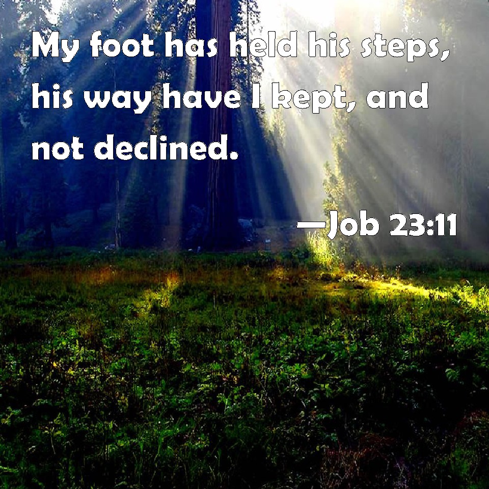 Choose a Background Job 23:11 My foot has held his steps, his way have I kept, and not declined. KJV: My foot hath held his steps, his way have I kept, and not declined. DRB: My foot hath followed his steps, I have kept his way, and have not declined from it. DBT: My foot hath held to his steps; his way have I kept, and not turned aside. ERV: My foot hath held fast to his steps; his way have I kept, and turned not aside. WBT: My foot hath held his steps, his way have I kept, and not declined. WEB: My foot has held fast to his steps. I have kept his way, and not turned aside. YLT: On His step hath my foot laid hold, His way I have kept, and turn not aside,Links Job 23:11 NIV • Job 23:11 NLT • Job 23:11 ESV • Job 23:11 NASB • Job 23:11 KJV • Job 23:11 Interlinear • Job 23:11 Commentaries • Job 23:11 Parallel Texts • Job 23:11 Bible Apps • Job 23:11 Parallel • Bible Hub |
