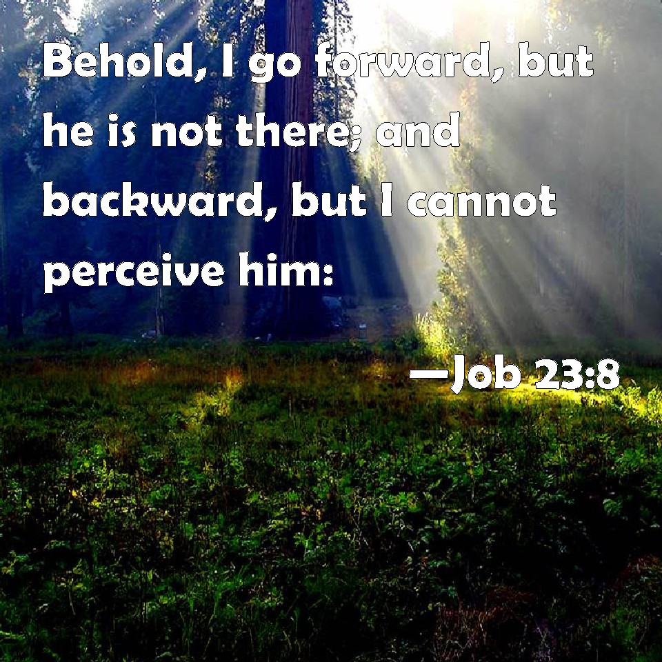 Choose a Background Job 23:8 Behold, I go forward, but he is not there; and backward, but I cannot perceive him: KJV: Behold, I go forward, but he is not there; and backward, but I cannot perceive him: DRB: But if I go to the east, he appeareth not; if to the west, I shall not understand him. DBT: Lo, I go forward, but he is not there; and backward, but I do not perceive him; ERV: Behold, I go forward, but he is not there; and backward, but I cannot perceive him: WBT: Behold, I go forward, but he is not there; and backward, but I cannot perceive him: WEB: "If I go east, he is not there; if west, I can't find him; YLT: Lo, forward I go — and He is not, And backward — and I perceive him not.Links Job 23:8 NIV • Job 23:8 NLT • Job 23:8 ESV • Job 23:8 NASB • Job 23:8 KJV • Job 23:8 Interlinear • Job 23:8 Commentaries • Job 23:8 Parallel Texts • Job 23:8 Bible Apps • Job 23:8 Parallel • Bible Hub |