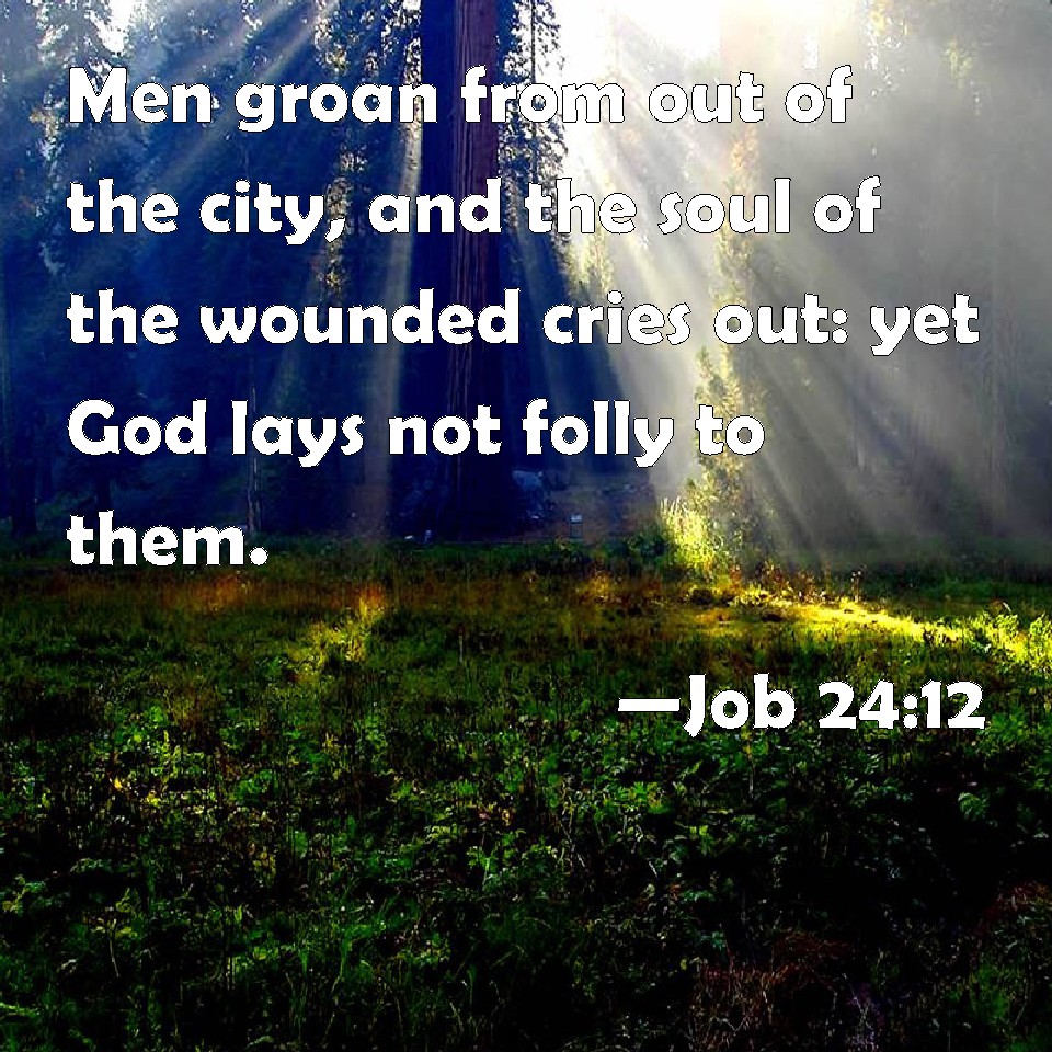 Choose a Background Job 24:12 Men groan from out of the city, and the soul of the wounded cries out: yet God lays not folly to them. KJV: Men groan from out of the city, and the soul of the wounded crieth out: yet God layeth not folly to them. DRB: Out of the cities they have made men to groan, and the soul of the wounded hath cried out, and God doth not suffer it to pass unrevenged. DBT: Men groan from out of the city, and the soul of the wounded crieth out; and +God imputeth not the impiety. ERV: From out of the populous city men groan, and the soul of the wounded crieth out: yet God imputeth it not for folly. WBT: Men groan from out of the city, and the soul of the wounded crieth out: yet God layeth not folly to them. WEB: From out of the populous city, men groan. The soul of the wounded cries out, yet God doesn't regard the folly. YLT: Because of enmity men do groan, And the soul of pierced ones doth cry, And God doth not give praise.Links Job 24:12 NIV • Job 24:12 NLT • Job 24:12 ESV • Job 24:12 NASB • Job 24:12 KJV • Job 24:12 Interlinear • Job 24:12 Commentaries • Job 24:12 Parallel Texts • Job 24:12 Bible Apps • Job 24:12 Parallel • Bible Hub |