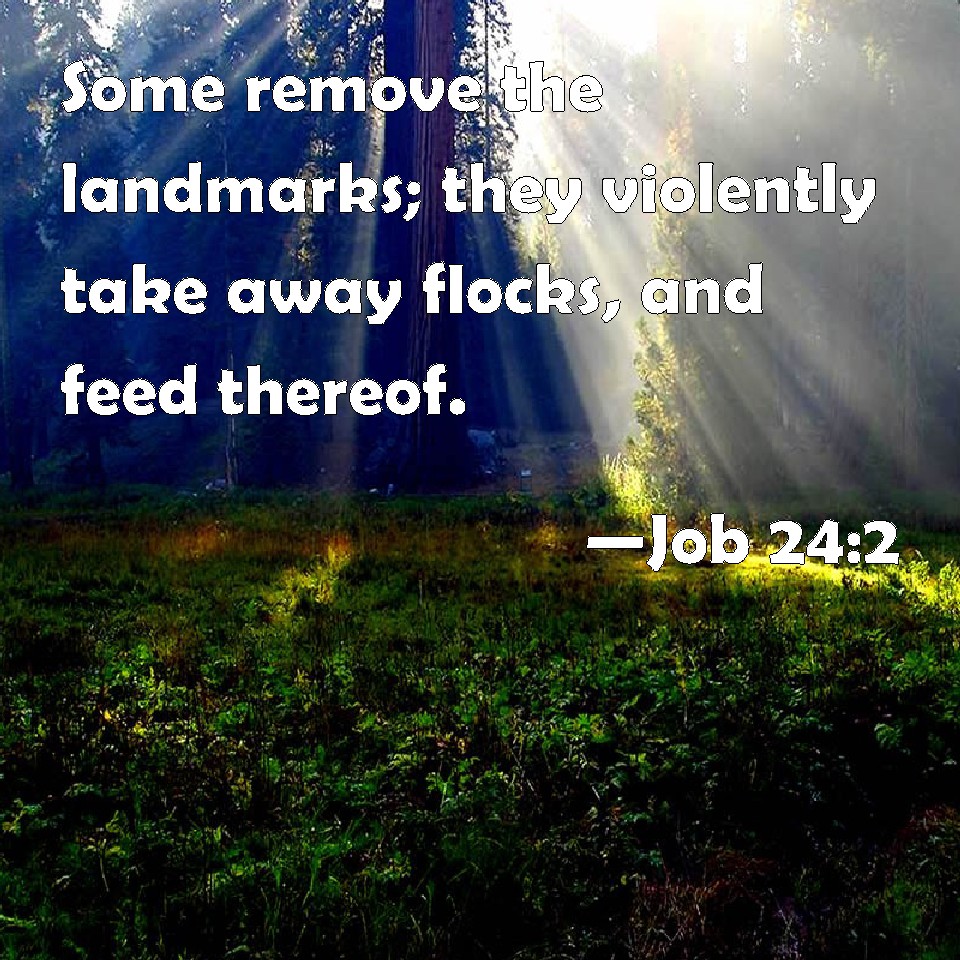 Choose a Background Job 24:2 Some remove the landmarks; they violently take away flocks, and feed thereof. KJV: Some remove the landmarks; they violently take away flocks, and feed thereof. DRB: Some have removed landmarks, have taken away flocks by force, and fed them. DBT: They remove the landmarks; they violently take away the flocks and pasture them; ERV: There are that remove the landmarks; they violently take away flocks, and feed them. WBT: Some remove the landmarks: they violently take away flocks, and their feed. WEB: There are people who remove the landmarks. They violently take away flocks, and feed them. YLT: The borders they reach, A drove they have taken violently away, Yea, they do evil.Links Job 24:2 NIV • Job 24:2 NLT • Job 24:2 ESV • Job 24:2 NASB • Job 24:2 KJV • Job 24:2 Interlinear • Job 24:2 Commentaries • Job 24:2 Parallel Texts • Job 24:2 Bible Apps • Job 24:2 Parallel • Bible Hub |