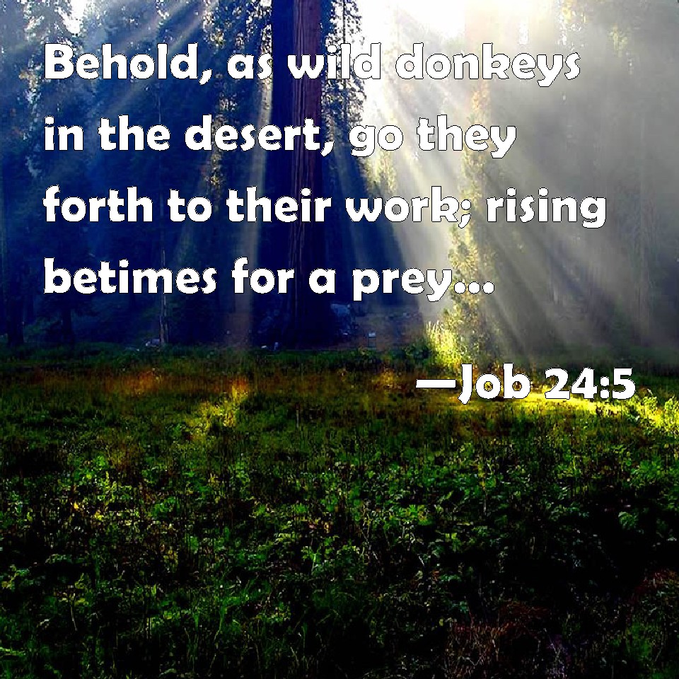 Choose a Background Job 24:5 Behold, as wild asses in the desert, go they forth to their work; rising betimes for a prey: the wilderness yields food for them and for their children. KJV: Behold, as wild asses in the desert, go they forth to their work; rising betimes for a prey: the wilderness yieldeth food for them and for their children. DRB: Others like wild asses in the desert go forth to their work: by watching for a prey they get bread for their children. DBT: Lo, as wild asses in the desert, they go forth to their work, seeking early for the prey: the wilderness yieldeth them food for their children. ERV: Behold, as wild asses in the desert they go forth to their work, seeking diligently for meat; the wilderness yieldeth them food for their children. WBT: Behold, as wild asses in the desert, they go forth to their work; rising betimes for a prey: the wilderness yieldeth food for them and for their children. WEB: Behold, as wild donkeys in the desert, they go forth to their work, seeking diligently for food. The wilderness yields them bread for their children. YLT: Lo, wild asses in a wilderness, They have gone out about their work, Seeking early for prey, A mixture for himself — food for young ones.Links Job 24:5 NIV • Job 24:5 NLT • Job 24:5 ESV • Job 24:5 NASB • Job 24:5 KJV • Job 24:5 Interlinear • Job 24:5 Commentaries • Job 24:5 Parallel Texts • Job 24:5 Bible Apps • Job 24:5 Parallel • Bible Hub |