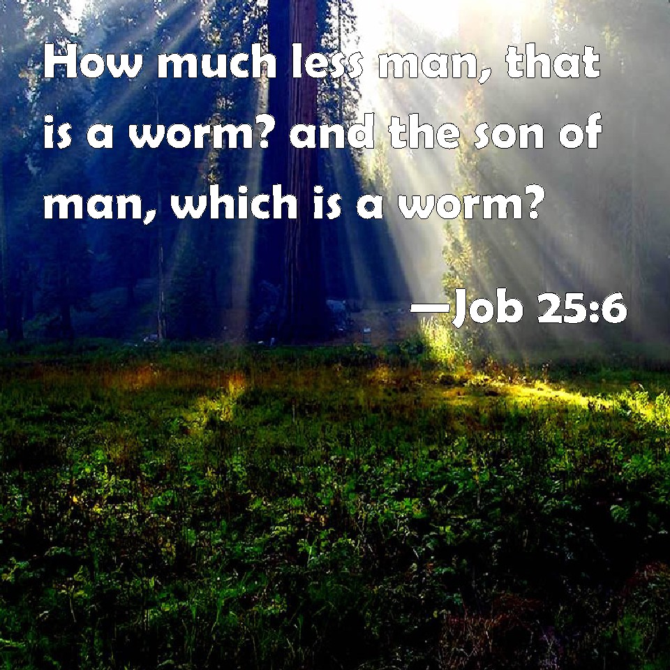Choose a Background Job 25:6 How much less man, that is a worm? and the son of man, which is a worm? KJV: How much less man, that is a worm? and the son of man, which is a worm? DRB: How much less man that is rottenness and the son of man who is a worm? DBT: How much less man, a worm, and the son of man, a worm! ERV: How much less man, that is a worm! and the son of man, which is a worm! WBT: How much less man, that is a worm; and the son of man, who is a worm? WEB: How much less man, who is a worm, the son of man, who is a worm!" YLT: How much less man — a grub, And the son of man — a worm!Links Job 25:6 NIV • Job 25:6 NLT • Job 25:6 ESV • Job 25:6 NASB • Job 25:6 KJV • Job 25:6 Interlinear • Job 25:6 Commentaries • Job 25:6 Parallel Texts • Job 25:6 Bible Apps • Job 25:6 Parallel • Bible Hub |