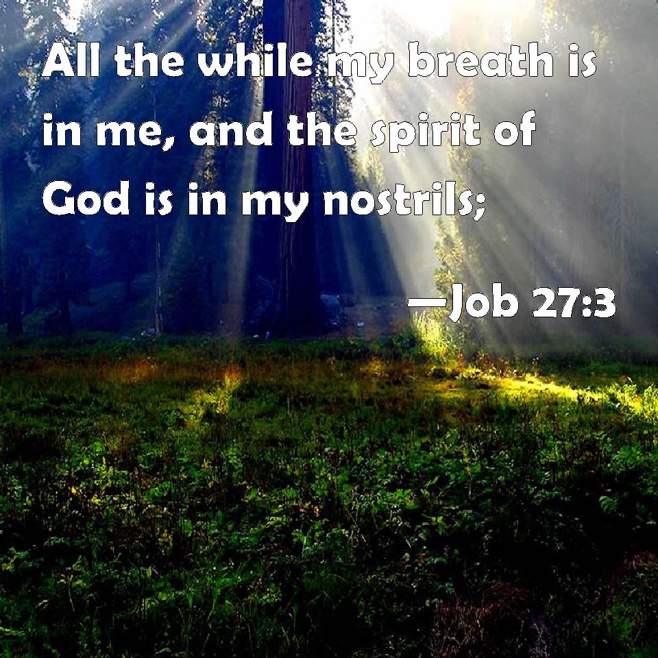 Choose a Background Job 27:3 All the while my breath is in me, and the spirit of God is in my nostrils; KJV: All the while my breath is in me, and the spirit of God is in my nostrils; DRB: As long as breath remaineth in me, and the spirit of God in my nostrils, DBT: All the while my breath is in me, and the spirit of +God is in my nostrils, ERV: (For my life is yet whole in me, and the spirit of God is in my nostrils;) WBT: All the while my breath is in me, and the spirit of God is in my nostrils; WEB: (For the length of my life is still in me, and the spirit of God is in my nostrils); YLT: For all the while my breath is in me, And the spirit of God in my nostrils.Links Job 27:3 NIV • Job 27:3 NLT • Job 27:3 ESV • Job 27:3 NASB • Job 27:3 KJV • Job 27:3 Interlinear • Job 27:3 Commentaries • Job 27:3 Parallel Texts • Job 27:3 Bible Apps • Job 27:3 Parallel • Bible Hub |