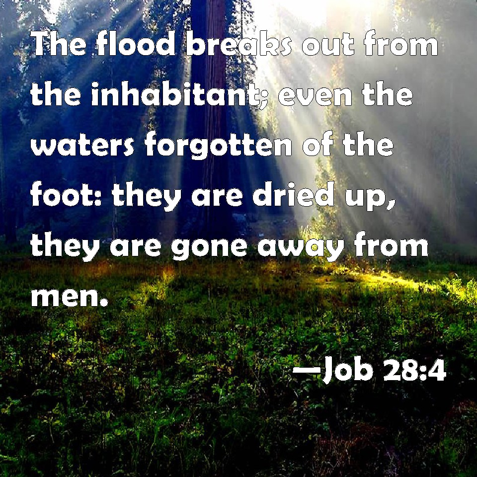 Choose a Background Job 28:4 The flood breaks out from the inhabitant; even the waters forgotten of the foot: they are dried up, they are gone away from men. KJV: The flood breaketh out from the inhabitant; even the waters forgotten of the foot: they are dried up, they are gone away from men. DRB: The flood divideth from the people that are on their journey, those whom the food of the needy man hath forgotten, and who cannot be come at. DBT: He openeth a shaft far from the inhabitants of the earth: forgotten of the foot, they hang suspended; away below men they hover. ERV: He breaketh open a shaft away from where men sojourn; they are forgotten of the foot that passeth by; they hang afar from men, they swing to and fro. WBT: The flood breaketh out from the inhabitant: even the waters forgotten by the foot: they are dried up, they have gone away from men. WEB: He breaks open a shaft away from where people live. They are forgotten by the foot. They hang far from men, they swing back and forth. YLT: A stream hath broken out from a sojourner, Those forgotten of the foot, They were low, from man they wandered.Links Job 28:4 NIV • Job 28:4 NLT • Job 28:4 ESV • Job 28:4 NASB • Job 28:4 KJV • Job 28:4 Interlinear • Job 28:4 Commentaries • Job 28:4 Parallel Texts • Job 28:4 Bible Apps • Job 28:4 Parallel • Bible Hub |