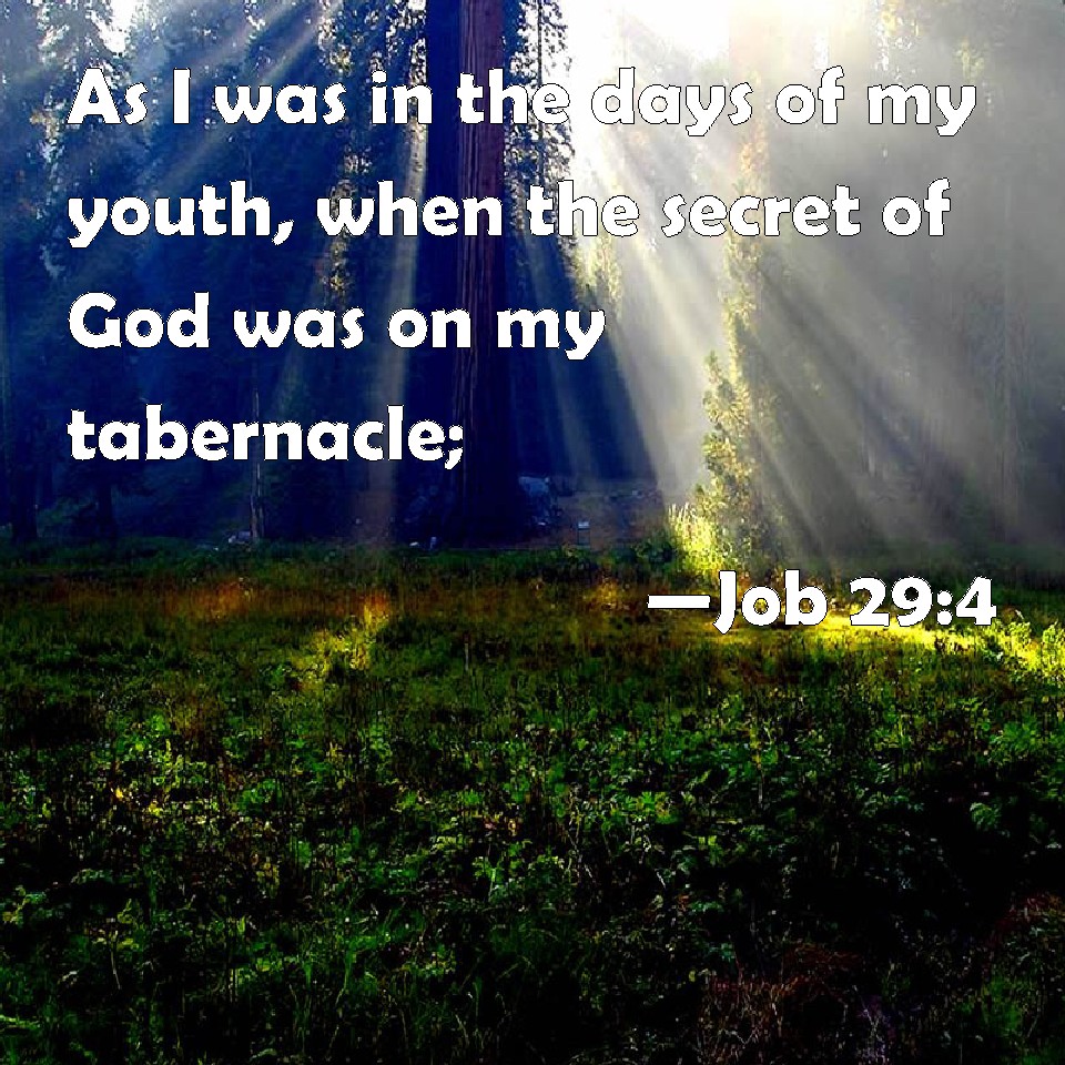 Choose a Background Job 29:4 As I was in the days of my youth, when the secret of God was on my tabernacle; KJV: As I was in the days of my youth, when the secret of God was upon my tabernacle; DRB: As I was in the days of my youth, when God was secretly in my tabernacle? DBT: As I was in the days of my youth, when the secret counsel of +God was over my tent, ERV: As I was in the ripeness of my days, when the secret of God was upon my tent; WBT: As I was in the days of my youth, when the secret of God was upon my tabernacle; WEB: as I was in the ripeness of my days, when the friendship of God was in my tent, YLT: As I have been in days of my maturity, And the counsel of God upon my tent.Links Job 29:4 NIV • Job 29:4 NLT • Job 29:4 ESV • Job 29:4 NASB • Job 29:4 KJV • Job 29:4 Interlinear • Job 29:4 Commentaries • Job 29:4 Parallel Texts • Job 29:4 Bible Apps • Job 29:4 Parallel • Bible Hub |