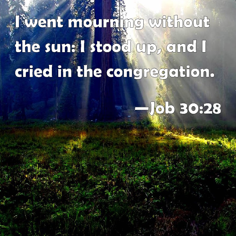 Choose a Background Job 30:28 I went mourning without the sun: I stood up, and I cried in the congregation. KJV: I went mourning without the sun: I stood up, and I cried in the congregation. DRB: I went mourning without indignation; I rose up, and cried in the crowd. DBT: I go about blackened, but not by the sun; I stand up, I cry in the congregation. ERV: I go mourning without the sun: I stand up in the assembly, and cry for help. WBT: I went mourning without the sun: I stood up, and I cried in the congregation. WEB: I go mourning without the sun. I stand up in the assembly, and cry for help. YLT: Mourning I have gone without the sun, I have risen, in an assembly I cry.Links Job 30:28 NIV • Job 30:28 NLT • Job 30:28 ESV • Job 30:28 NASB • Job 30:28 KJV • Job 30:28 Interlinear • Job 30:28 Commentaries • Job 30:28 Parallel Texts • Job 30:28 Bible Apps • Job 30:28 Parallel • Bible Hub |