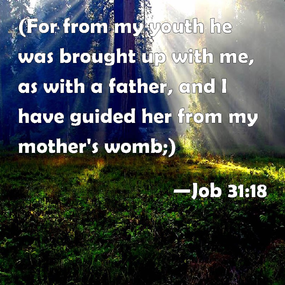 Choose a Background Job 31:18 (For from my youth he was brought up with me, as with a father, and I have guided her from my mother's womb;) KJV: (For from my youth he was brought up with me, as with a father, and I have guided her from my mother's womb;) DRB: (For from my infancy mercy grew up with me: and it came out with me from my mother's womb :) DBT: (For from my youth he grew up with me as with a father, and I have guided the widow from my mother's womb;) ERV: (Nay, from my youth he grew up with me as with a father, and I have been her guide from my mother's womb;) WBT: (For from my youth he was brought up with me, as with a father, and I have guided her from my mother's womb;) WEB: (no, from my youth he grew up with me as with a father, her have I guided from my mother's womb); YLT: (But from my youth He grew up with me as with a father, And from the belly of my mother I am led.)Links Job 31:18 NIV • Job 31:18 NLT • Job 31:18 ESV • Job 31:18 NASB • Job 31:18 KJV • Job 31:18 Interlinear • Job 31:18 Commentaries • Job 31:18 Parallel Texts • Job 31:18 Bible Apps • Job 31:18 Parallel • Bible Hub |