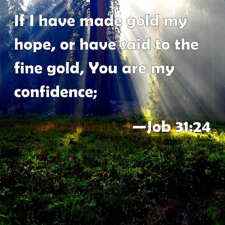 Choose a Background Job 31:24 If I have made gold my hope, or have said to the fine gold, You are my confidence; KJV: If I have made gold my hope, or have said to the fine gold, Thou art my confidence; DRB: If I have thought gold my strength, and have said to fine gold: My confidence: DBT: If I have made gold my hope, or said to the fine gold, My confidence! ERV: If I have made gold my hope, and have said to the fine gold, Thou art my confidence; WBT: If I have made gold my hope, or have said to the fine gold, Thou art my confidence; WEB: "If I have made gold my hope, and have said to the fine gold, 'You are my confidence;' YLT: If I have made gold my confidence, And to the pure gold have said, 'My trust,'Links Job 31:24 NIV • Job 31:24 NLT • Job 31:24 ESV • Job 31:24 NASB • Job 31:24 KJV • Job 31:24 Interlinear • Job 31:24 Commentaries • Job 31:24 Parallel Texts • Job 31:24 Bible Apps • Job 31:24 Parallel • Bible Hub |