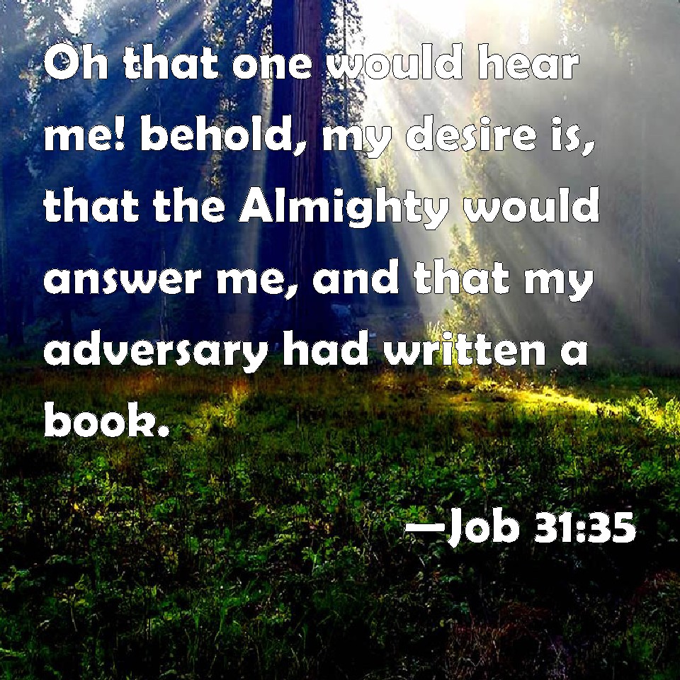 Choose a Background Job 31:35 Oh that one would hear me! behold, my desire is, that the Almighty would answer me, and that my adversary had written a book. KJV: Oh that one would hear me! behold, my desire is, that the Almighty would answer me, and that mine adversary had written a book. DRB: Who would grant me a hearer, that the Almighty may hear my desire; and that he himself that judgeth would write a book, DBT: Oh that I had one to hear me! Behold my signature: let the Almighty answer me! And let mine opponent write an accusation! ERV: Oh that I had one to hear me! (lo, here is my signature, let the Almighty answer me;) and that I had the indictment which mine adversary hath written! WBT: Oh that one would hear me! behold, my desire is, that the Almighty would answer me, and that my adversary had written a book. WEB: oh that I had one to hear me! (behold, here is my signature, let the Almighty answer me); let the accuser write my indictment! YLT: Who giveth to me a hearing? lo, my mark. The Mighty One doth answer me, And a bill hath mine adversary written.Links Job 31:35 NIV • Job 31:35 NLT • Job 31:35 ESV • Job 31:35 NASB • Job 31:35 KJV • Job 31:35 Interlinear • Job 31:35 Commentaries • Job 31:35 Parallel Texts • Job 31:35 Bible Apps • Job 31:35 Parallel • Bible Hub |