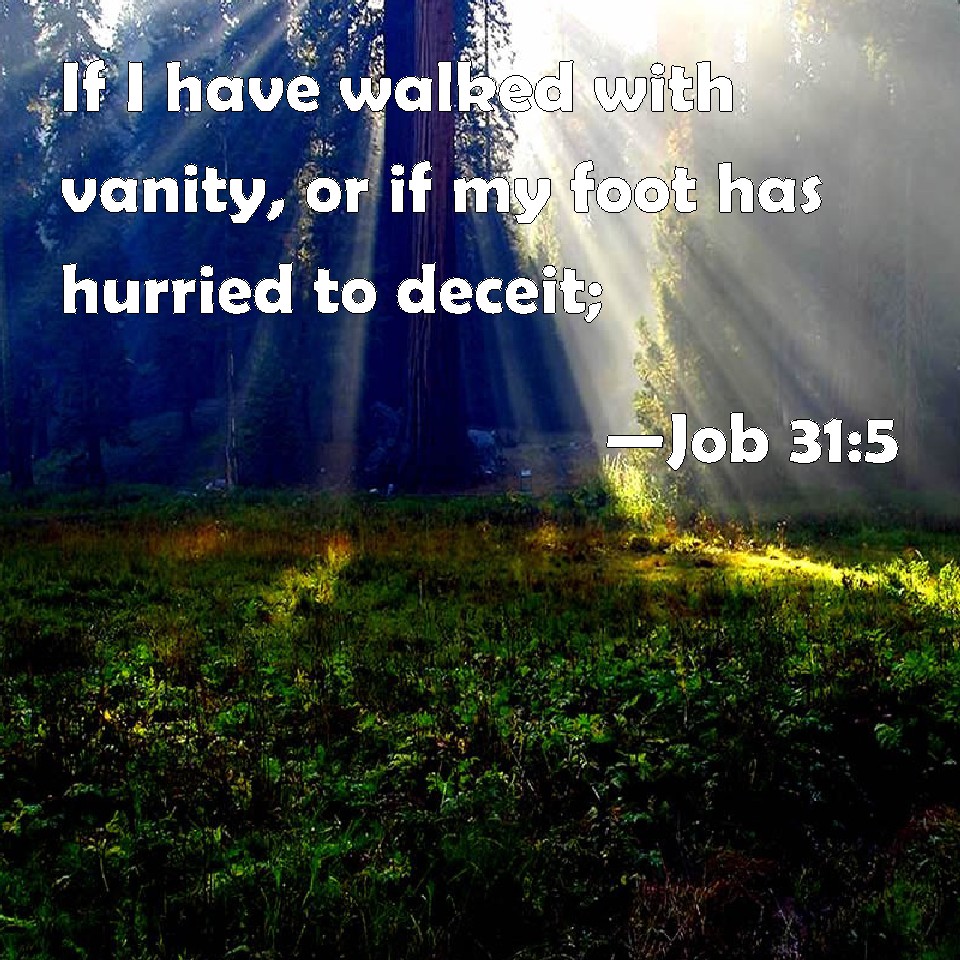Choose a Background Job 31:5 If I have walked with vanity, or if my foot has hurried to deceit; KJV: If I have walked with vanity, or if my foot hath hasted to deceit; DRB: If I have walked in vanity, and my foot hath made haste to deceit: DBT: If I have walked with falsehood, and my foot hath hasted to deceit, ERV: If I have walked with vanity, and my foot hath hasted to deceit; WBT: If I have walked with vanity, or if my foot hath hasted to deceit; WEB: "If I have walked with falsehood, and my foot has hurried to deceit YLT: If I have walked with vanity, And my foot doth hasten to deceit,Links Job 31:5 NIV • Job 31:5 NLT • Job 31:5 ESV • Job 31:5 NASB • Job 31:5 KJV • Job 31:5 Interlinear • Job 31:5 Commentaries • Job 31:5 Parallel Texts • Job 31:5 Bible Apps • Job 31:5 Parallel • Bible Hub |