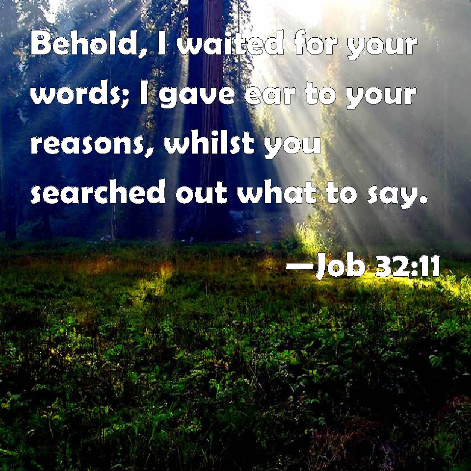Choose a Background Job 32:11 Behold, I waited for your words; I gave ear to your reasons, whilst you searched out what to say. KJV: Behold, I waited for your words; I gave ear to your reasons, whilst ye searched out what to say. DRB: For I have waited for your words, I have given ear to your wisdom, as long as you were disputing in words. DBT: Lo, I waited for your words; I gave ear to your reasonings, until ye searched out what to say. ERV: Behold, I waited for your words, I listened for your reasons, whilst ye searched out what to say. WBT: Behold, I waited for your words; I gave ear to your reasons, whilst ye searched out what to say. WEB: "Behold, I waited for your words, and I listened for your reasoning, while you searched out what to say. YLT: Lo, I have waited for your words, I give ear unto your reasons, Till ye search out sayings.Links Job 32:11 NIV • Job 32:11 NLT • Job 32:11 ESV • Job 32:11 NASB • Job 32:11 KJV • Job 32:11 Interlinear • Job 32:11 Commentaries • Job 32:11 Parallel Texts • Job 32:11 Bible Apps • Job 32:11 Parallel • Bible Hub |