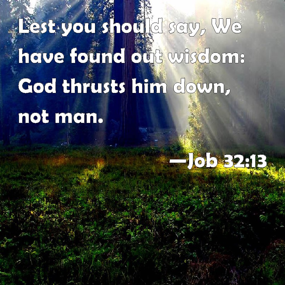 Choose a Background Job 32:13 Lest you should say, We have found out wisdom: God thrusts him down, not man. KJV: Lest ye should say, We have found out wisdom: God thrusteth him down, not man. DRB: Lest you should say : We have found wisdom, God hath cast him down, not man. DBT: That ye may not say, We have found out wisdom; God will make him yield, not man. ERV: Beware lest ye say, We have found wisdom; God may vanquish him, not man: WBT: Lest ye should say, We have found out wisdom: God thrusteth him down, not man. WEB: Beware lest you say, 'We have found wisdom, God may refute him, not man;' YLT: Lest ye say, We have found wisdom, God doth thrust him away, not man.Links Job 32:13 NIV • Job 32:13 NLT • Job 32:13 ESV • Job 32:13 NASB • Job 32:13 KJV • Job 32:13 Interlinear • Job 32:13 Commentaries • Job 32:13 Parallel Texts • Job 32:13 Bible Apps • Job 32:13 Parallel • Bible Hub |