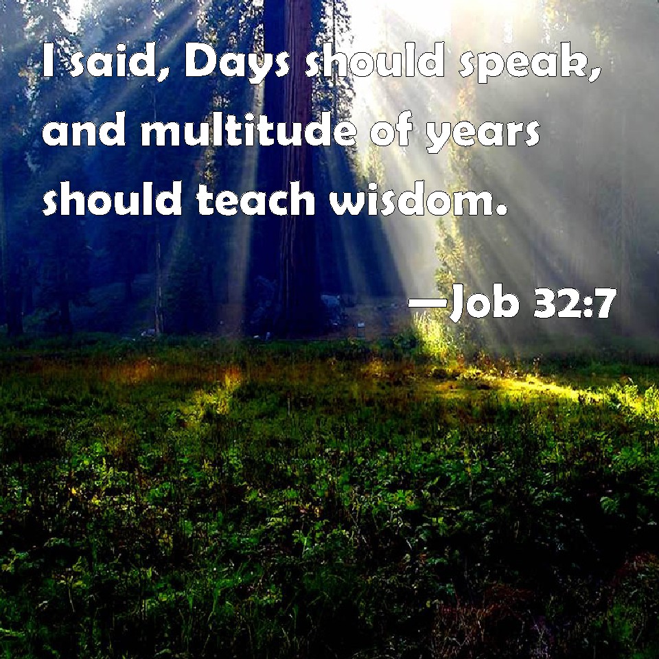 Choose a Background Job 32:7 I said, Days should speak, and multitude of years should teach wisdom. KJV: I said, Days should speak, and multitude of years should teach wisdom. DRB: For I hoped that greater age would speak, and that a multitude of years would teach wisdom. DBT: I said, Let days speak, and multitude of years teach wisdom. ERV: I said, Days should speak, and multitude of years should teach wisdom. WBT: I said, Days should speak, and multitude of years should teach wisdom. WEB: I said, 'Days should speak, and multitude of years should teach wisdom.' YLT: I said: Days do speak, And multitude of years teach wisdom.Links Job 32:7 NIV • Job 32:7 NLT • Job 32:7 ESV • Job 32:7 NASB • Job 32:7 KJV • Job 32:7 Interlinear • Job 32:7 Commentaries • Job 32:7 Parallel Texts • Job 32:7 Bible Apps • Job 32:7 Parallel • Bible Hub |