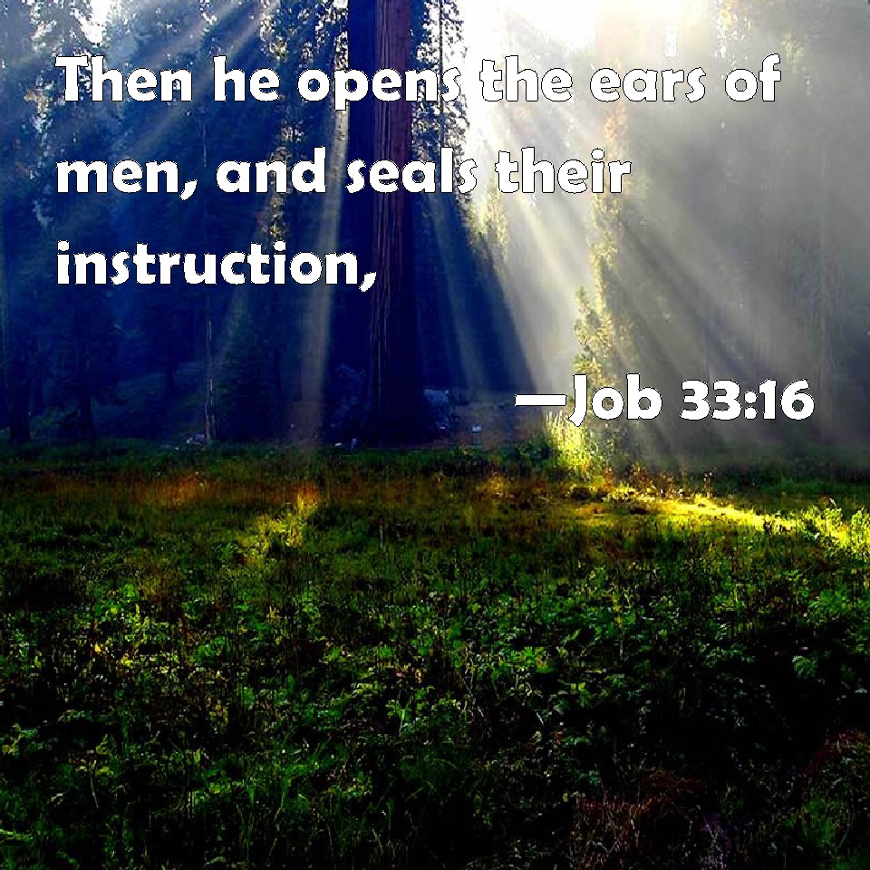 Choose a Background Job 33:16 Then he opens the ears of men, and seals their instruction, KJV: Then he openeth the ears of men, and sealeth their instruction, DRB: Then he openeth the ears of men, and teaching instructeth them in what they are to learn. DBT: Then he openeth men's ears, and sealeth their instruction, ERV: Then he openeth the ears of men, and sealeth their instruction, WBT: Then he openeth the ears of men, and sealeth their instruction, WEB: Then he opens the ears of men, and seals their instruction, YLT: Then He uncovereth the ear of men, And for their instruction sealeth:Links Job 33:16 NIV • Job 33:16 NLT • Job 33:16 ESV • Job 33:16 NASB • Job 33:16 KJV • Job 33:16 Interlinear • Job 33:16 Commentaries • Job 33:16 Parallel Texts • Job 33:16 Bible Apps • Job 33:16 Parallel • Bible Hub |