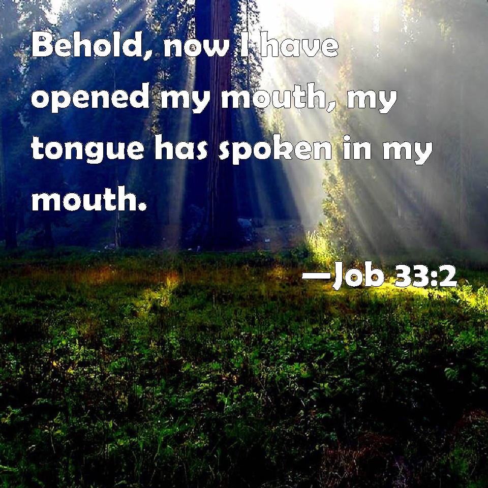 Choose a Background Job 33:2 Behold, now I have opened my mouth, my tongue has spoken in my mouth. KJV: Behold, now I have opened my mouth, my tongue hath spoken in my mouth. DRB: Behold now I have opened my mouth, let my tongue speak within my jaws. DBT: Behold now, I have opened my mouth, my tongue speaketh in my palate, ERV: Behold now, I have opened my mouth, my tongue hath spoken in my mouth. WBT: Behold, now I have opened my mouth, my tongue hath spoken in my mouth. WEB: See now, I have opened my mouth. My tongue has spoken in my mouth. YLT: Lo, I pray thee, I have opened my mouth, My tongue hath spoken in the palate.Links Job 33:2 NIV • Job 33:2 NLT • Job 33:2 ESV • Job 33:2 NASB • Job 33:2 KJV • Job 33:2 Interlinear • Job 33:2 Commentaries • Job 33:2 Parallel Texts • Job 33:2 Bible Apps • Job 33:2 Parallel • Bible Hub |
